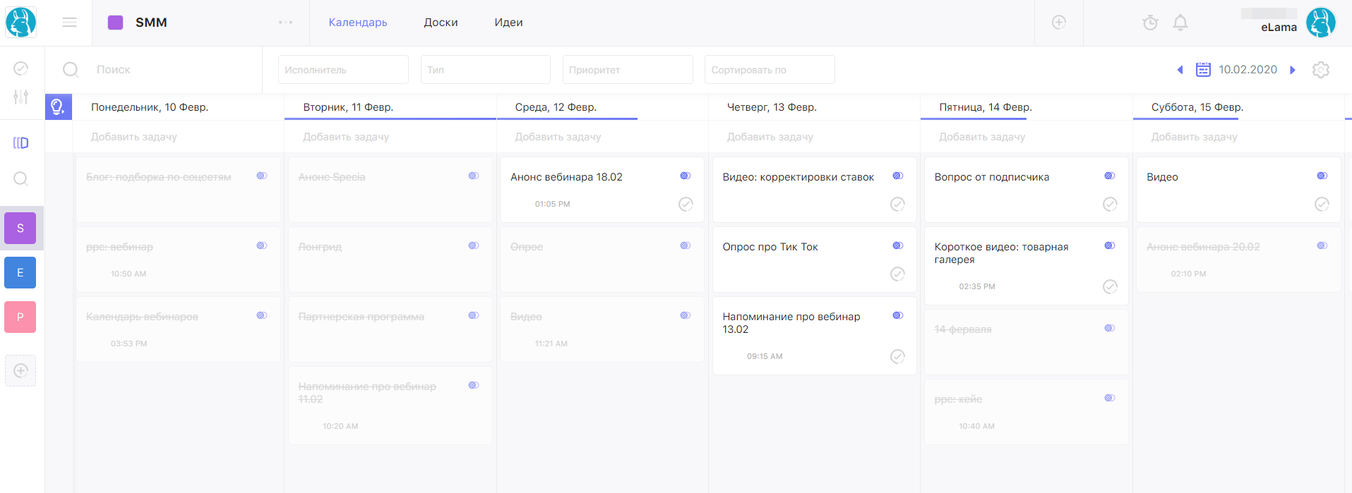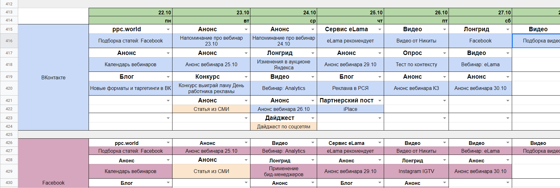 Other services did not fit my specific requirements: to be able to see activity for a week in one window, mark scheduled posts, indicate publishing deadlines, divide posts by segments..