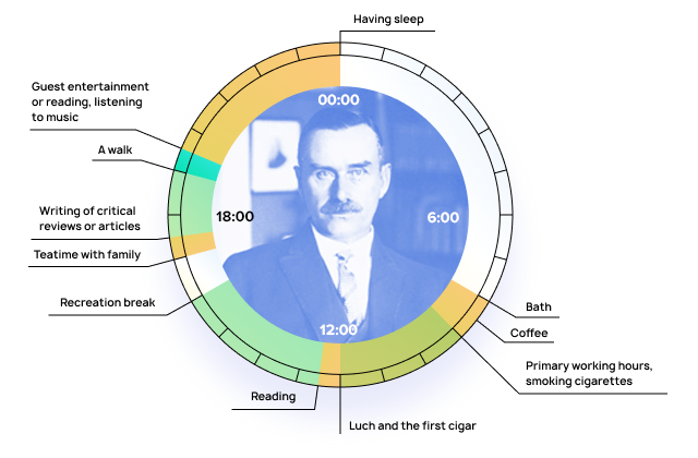 Writer, Nobel Prize Laureate in Literature for 1929. Daily routine in 1943.