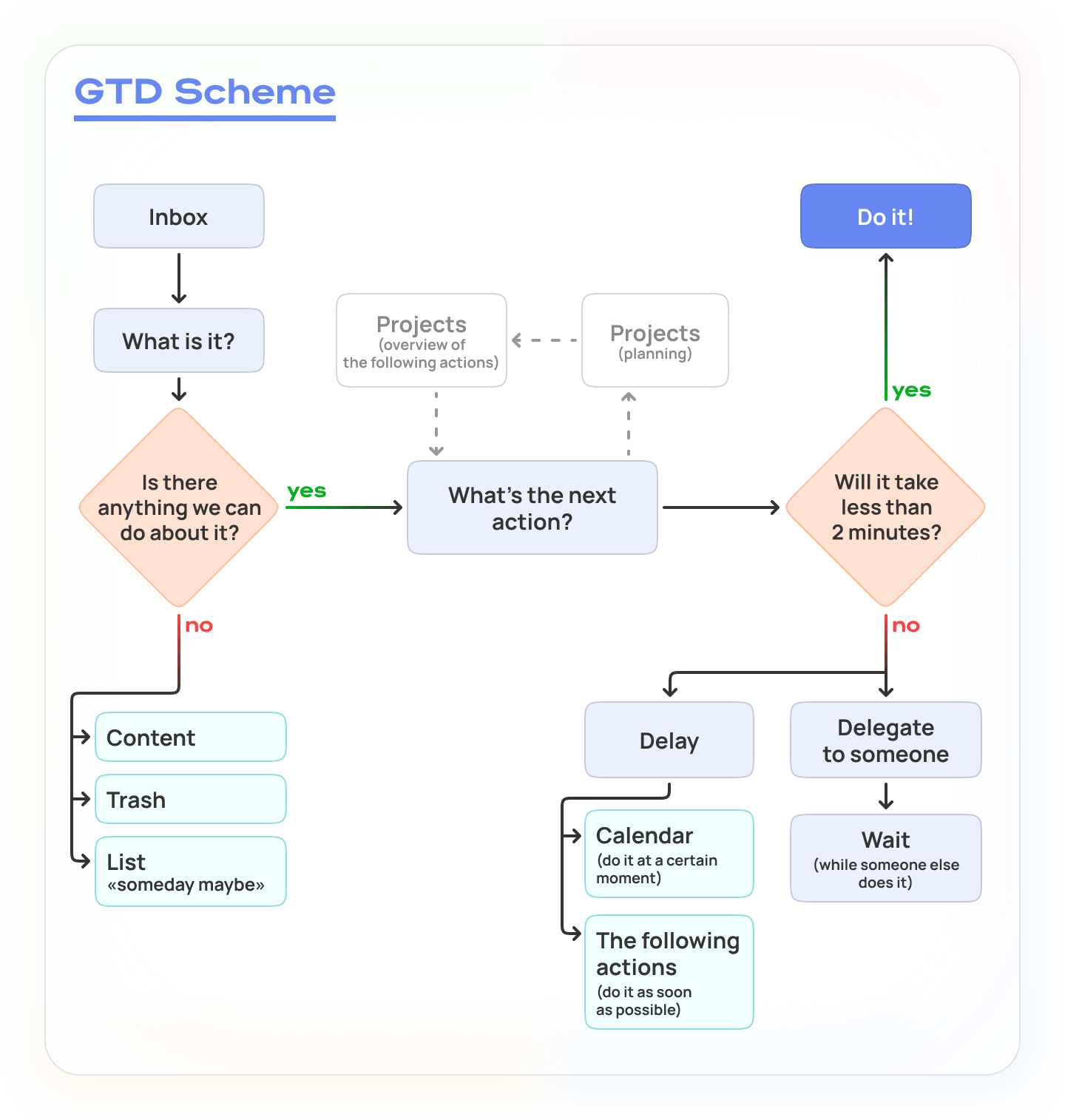 For me, GTD is not just a method for solving problems and scheduling. This is a lifestyle when you never worry about unfulfilled tasks, traumatizing the psyche — everything is measured and consistent here, you think only about the most important things and never forget about any deadlines, because you have "all the moves recorded".