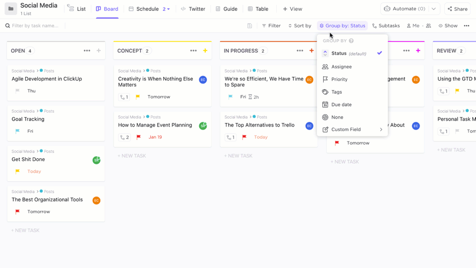 ClickUp is a highly functional replacement for Trello. Besides the board mode, it seems to have everything one can think of: a plethora of integrations, a time-tracker, notes, mind maps, spreadsheets, various task viewing modes (Gantt chart, list, calendar), and the ability to view tasks all in one place. Well, basically, it's got it all.