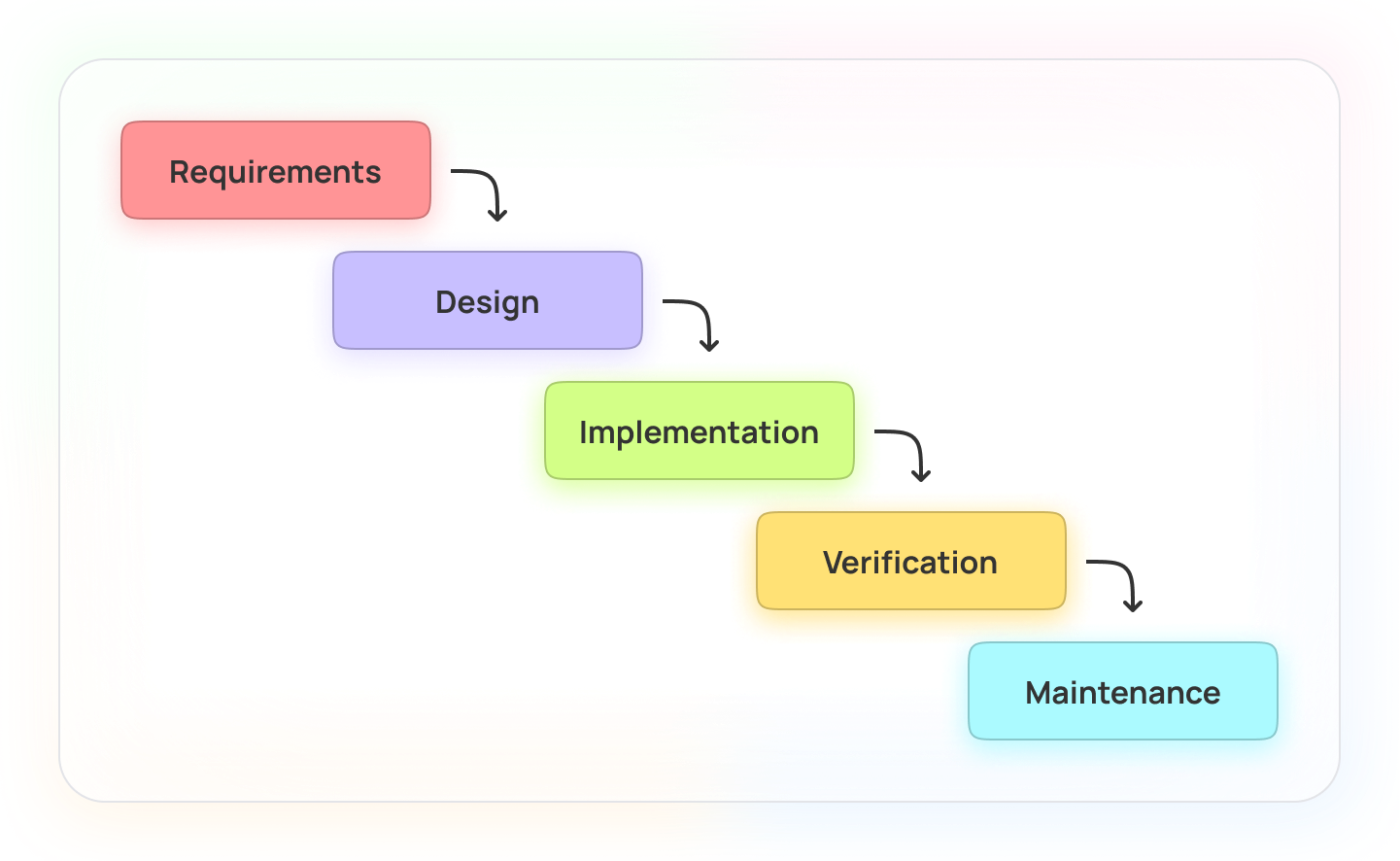 According to Waterfall, the work on the project should go in several stages, following each other, from the first to the last. Their number may vary from project to project, from scheme to scheme, but the essence is the same.
