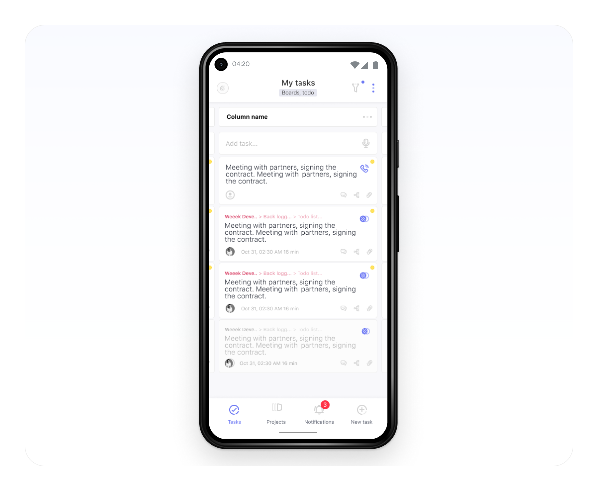 There are three dots in the upper-right corner next to the filters. If you click on them, you can switch between list mode and whiteboard mode. Functionally, the boards in the Android app are in no way inferior to the boards in the web version and the iOS app. You can: