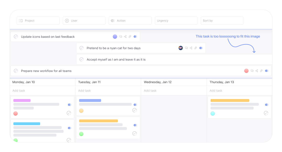We know that many tasks are not done in one day, but over a long period of time. But when a task has a deadline, its card on the calendar view is displayed only on day X, and this is not always convenient — you can easily forget about the task until it is too late. Specifically to solve the problem, we added long tasks to WEEEK. Such tasks are displayed above the columns of the calendar view in the form of a kind of timeline. They are always in sight, and you will not forget about them just like that.