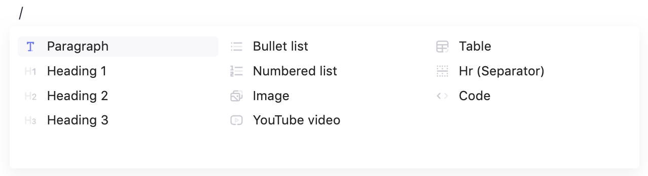 There was a hot key "/" to bring up the menu and edit the text: add a title, table, bulleted list, code and much more. Or you can call the menu on the right with the "More" button. (screencast above)