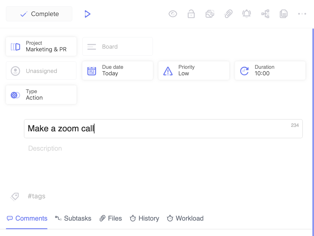 - Comments to discuss tasks with colleagues, attach links, etc.
