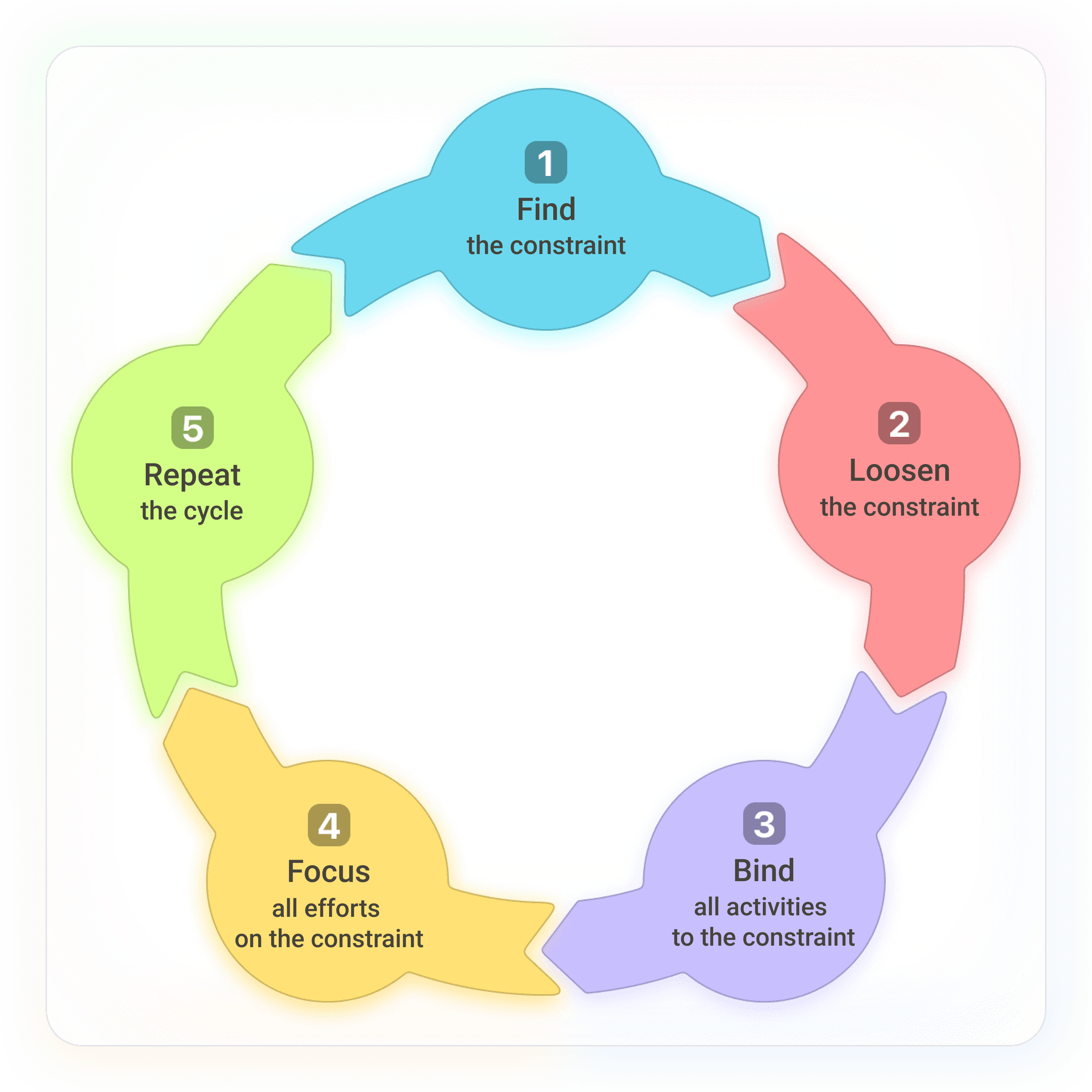 5. Repeat. This stage is very conditional - it is needed only to emphasize the cyclical nature of work on TOC. So, once you've dealt with one constraint, you'll need to find the next one that's holding the company back. Constant introspection is an important part of the Theory of Constraints.