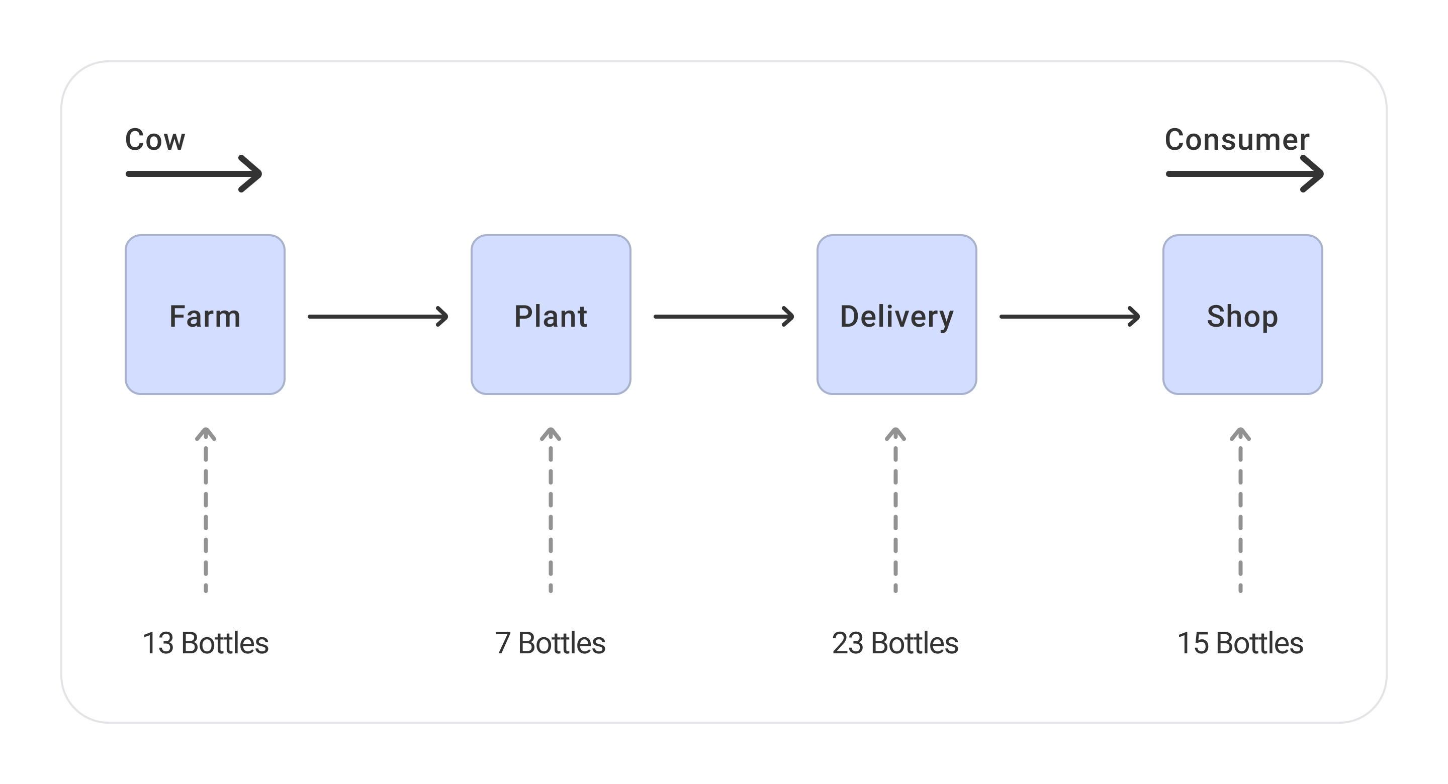 It's easiest to understand with an example. Imagine the supply chain of milk to stores (I don't guarantee that it is plausible in my example, but, as they say, "this is how I see it"). First, milk is extracted on the farm, then sent to the factory, where it is sterilized and packaged in containers. Next, the milk is sent with the help of a logistics company to a store where it is sold to end consumers. Let's say each stage has its own throughput - how many bottles of milk can pass through the stage in a period of time: