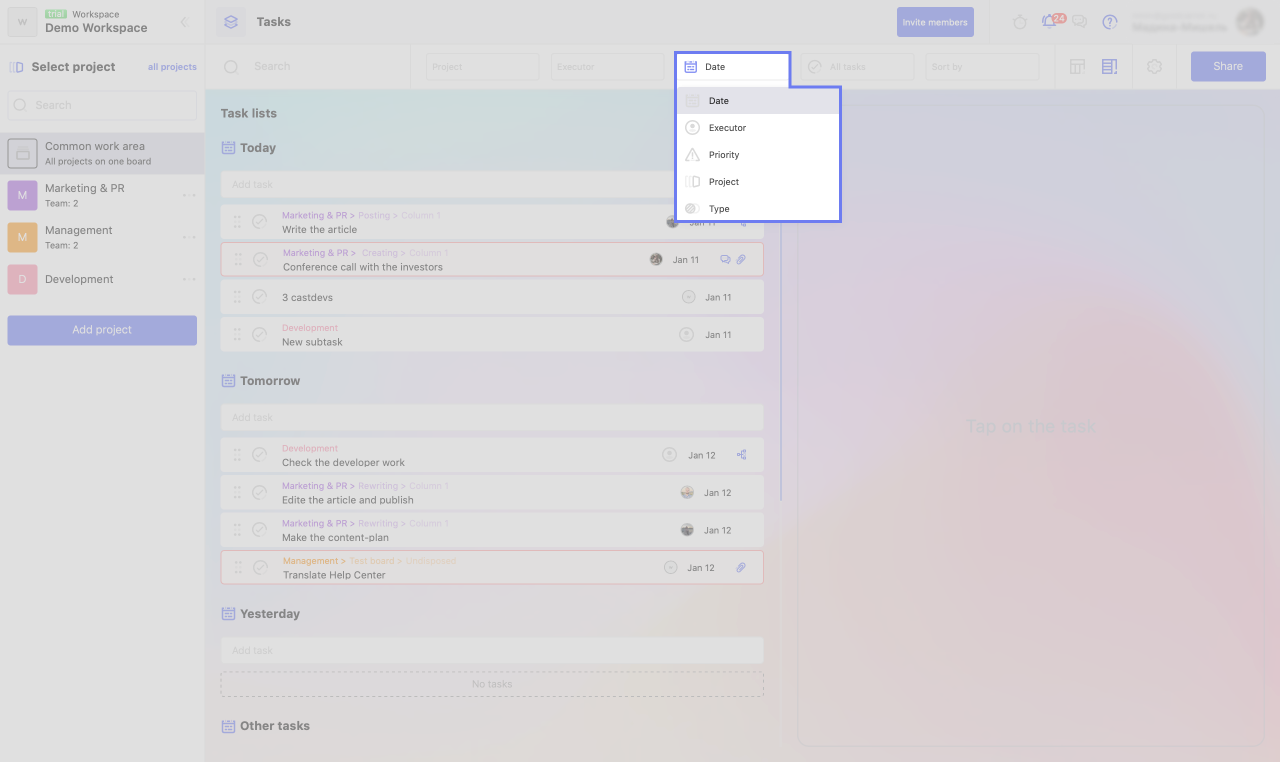 1. Open the Tasks tab in a project or shared workspace.