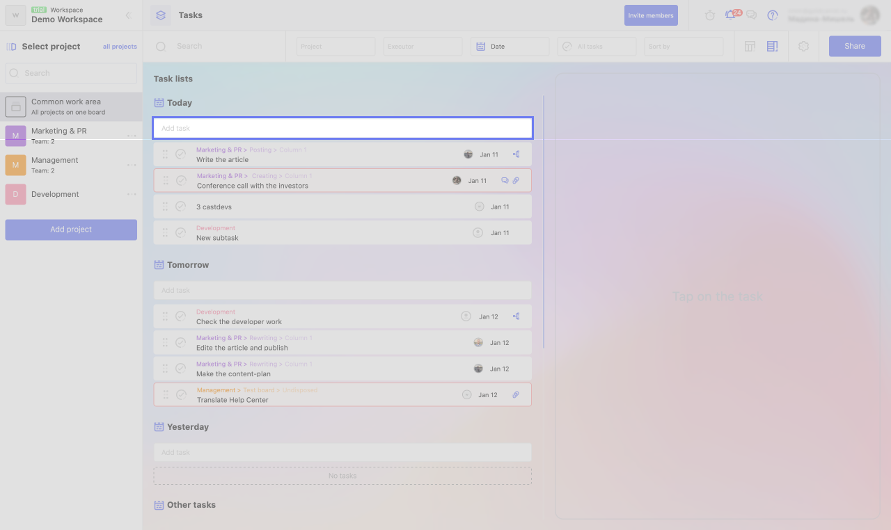 1. Place the cursor in the "Add task" field of the required list.