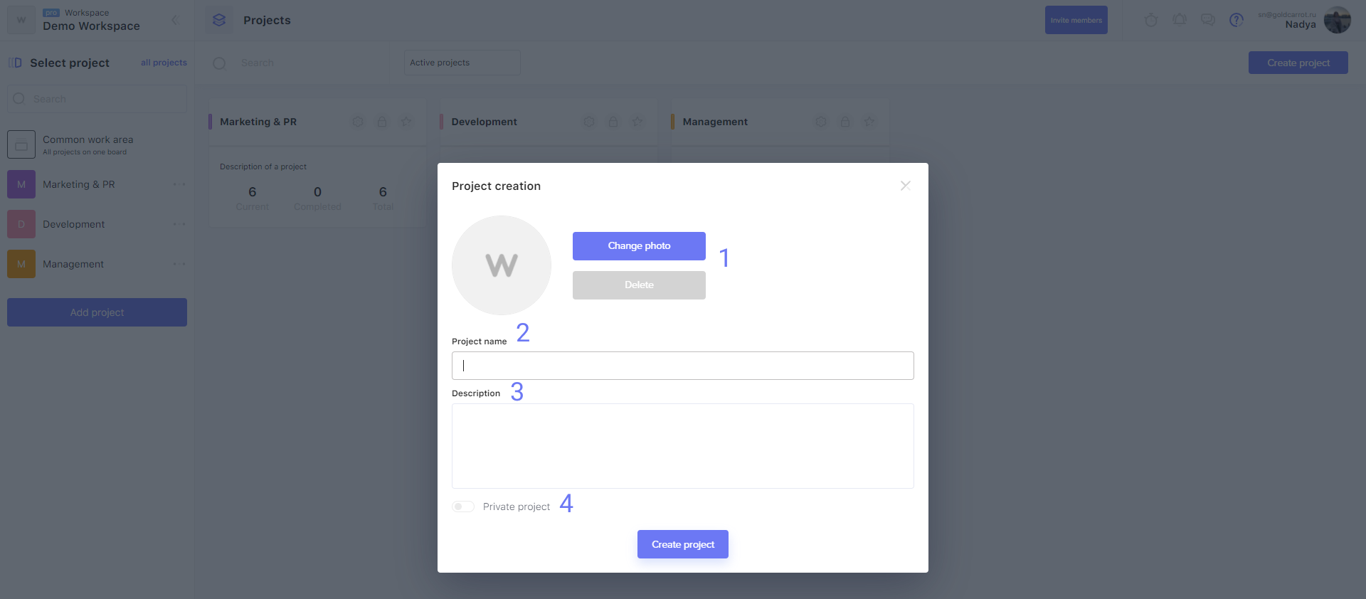 It is not necessary to fill in all the data — it is enough to write the name of the project. The rest you can add later, using the project settings.