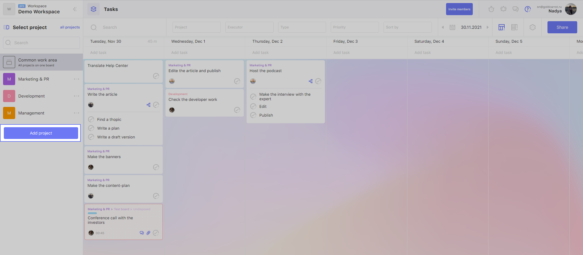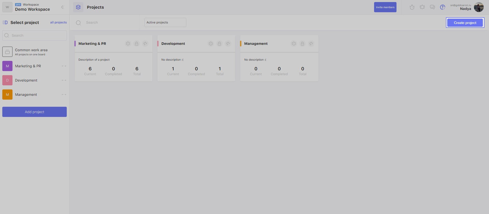 To create a project in the right workspace click the "Add project" button on the sidebar. If the sidebar is minimized, the button will not have a signature — only the "+" icon.