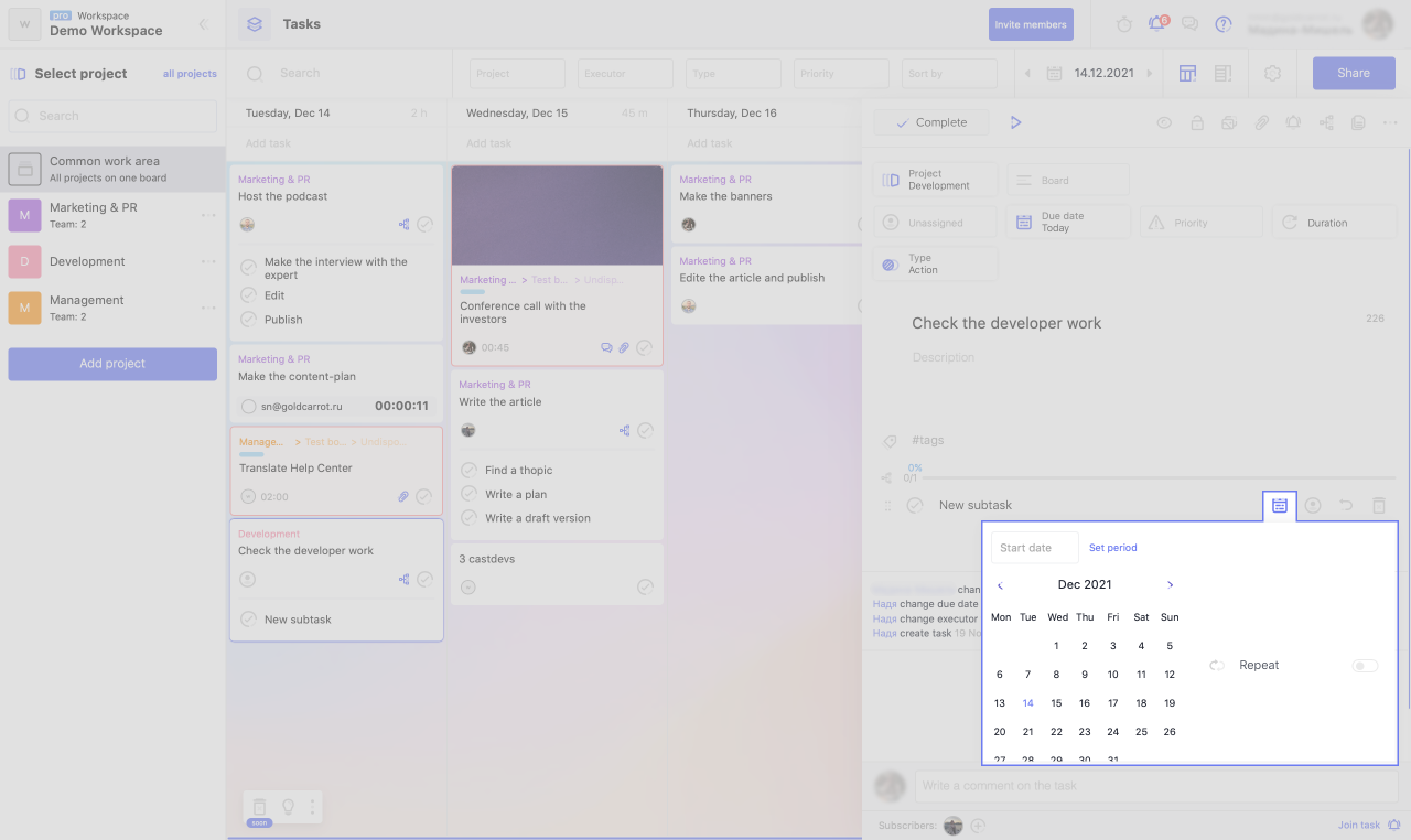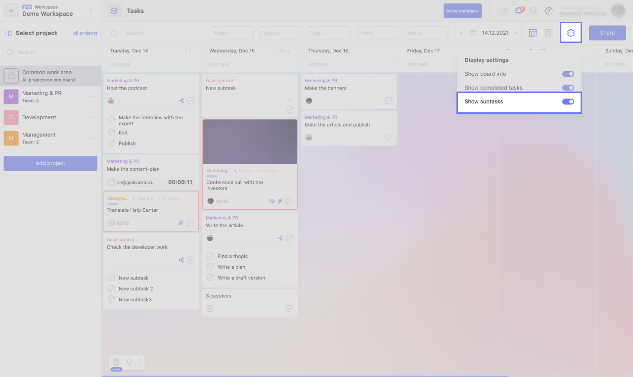 If you specify a deadline for a subtask, its card will appear on the calendar.
