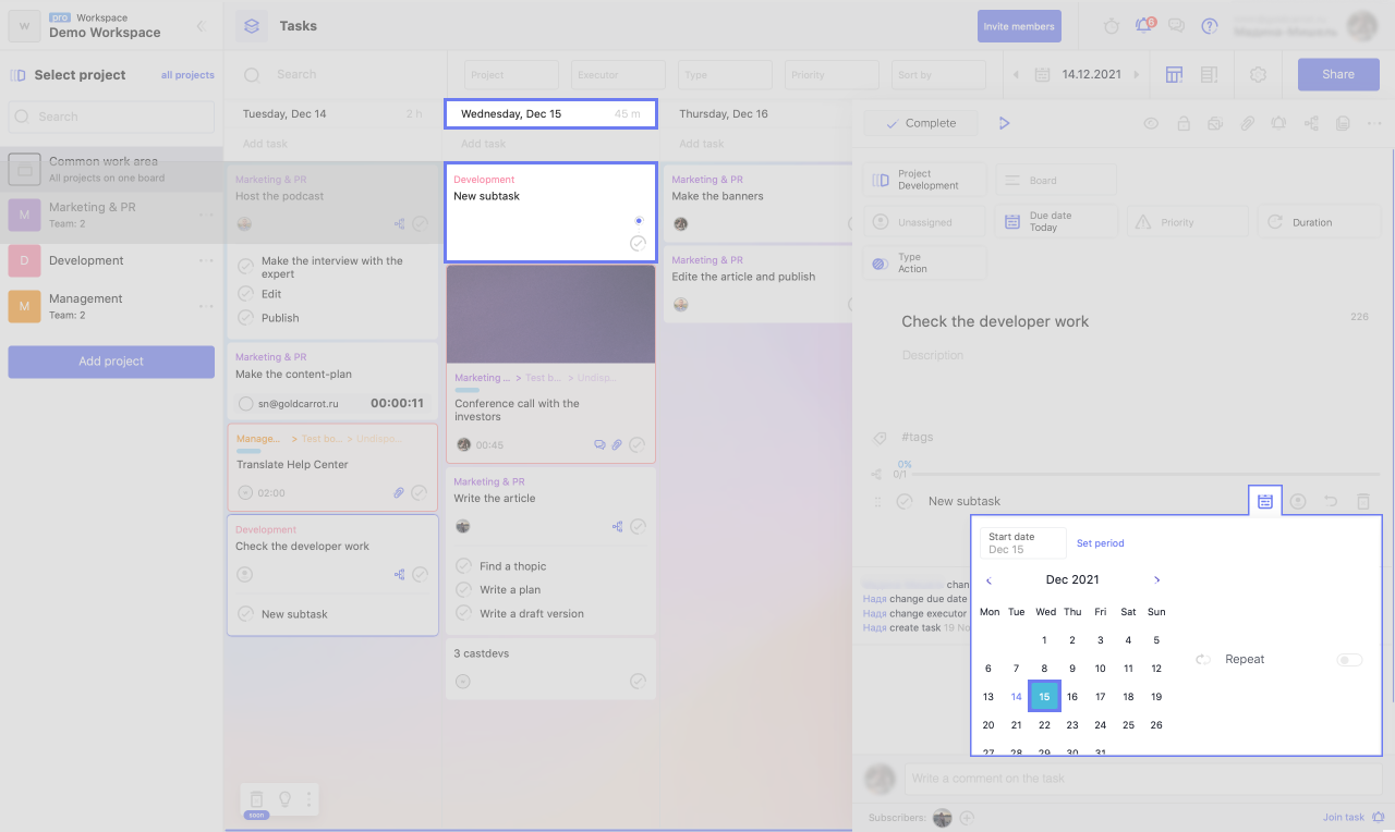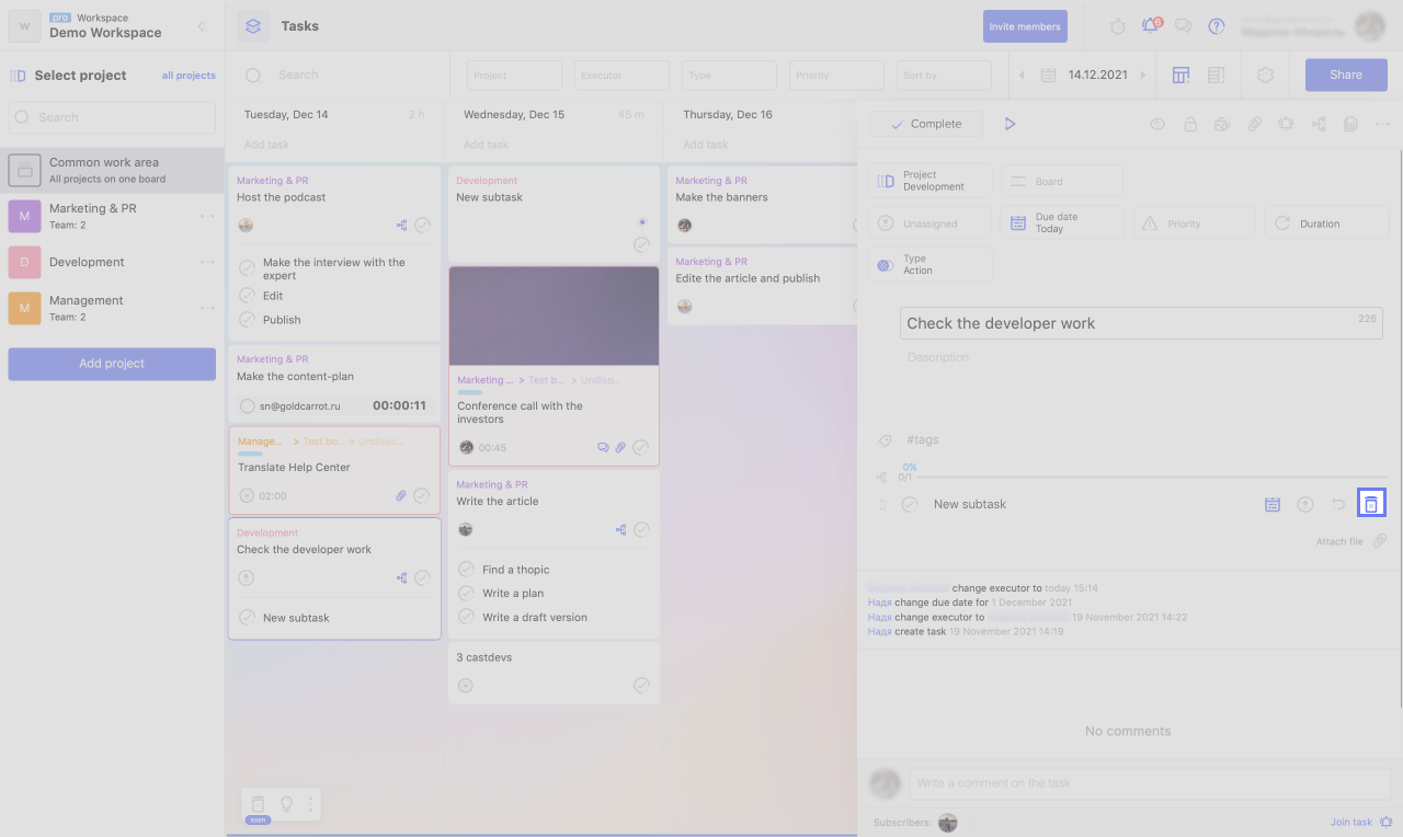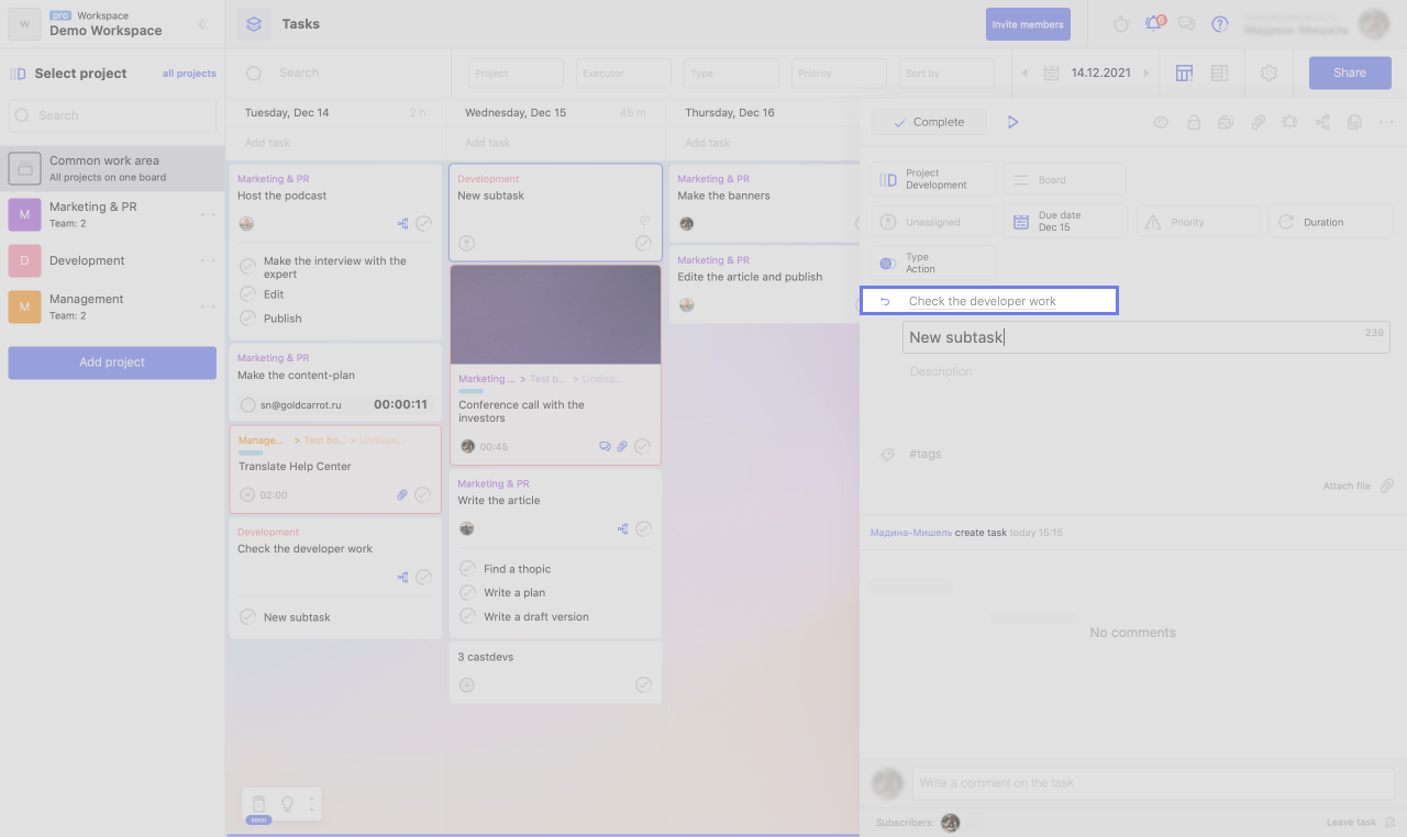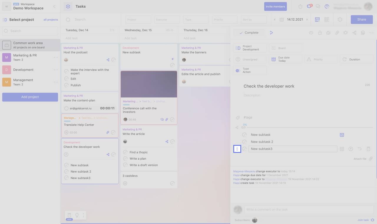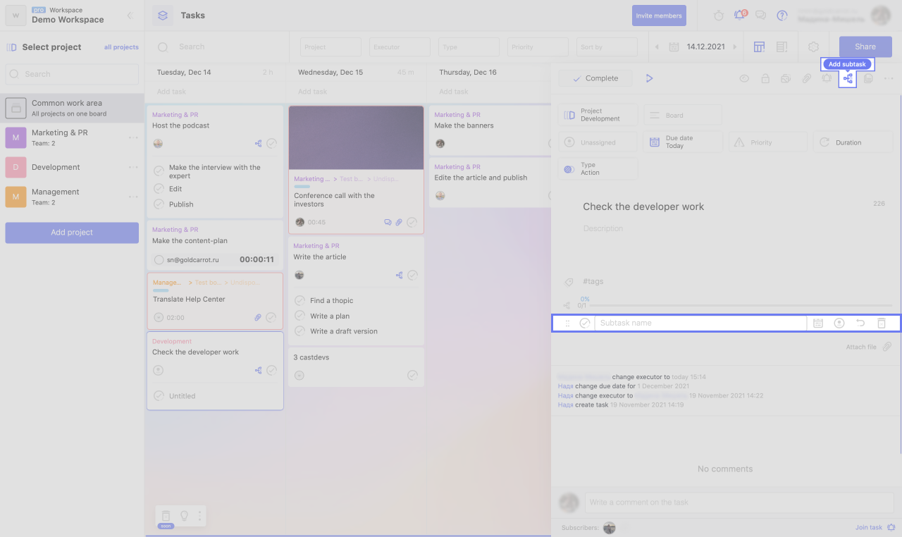 Without going into a subtask, you can specify the deadline and the executor. This is sufficient if the task is simple and does not require detailed explanations. If you want, for example, to add a description to a subtask, click on the arrow next to its name to get inside.