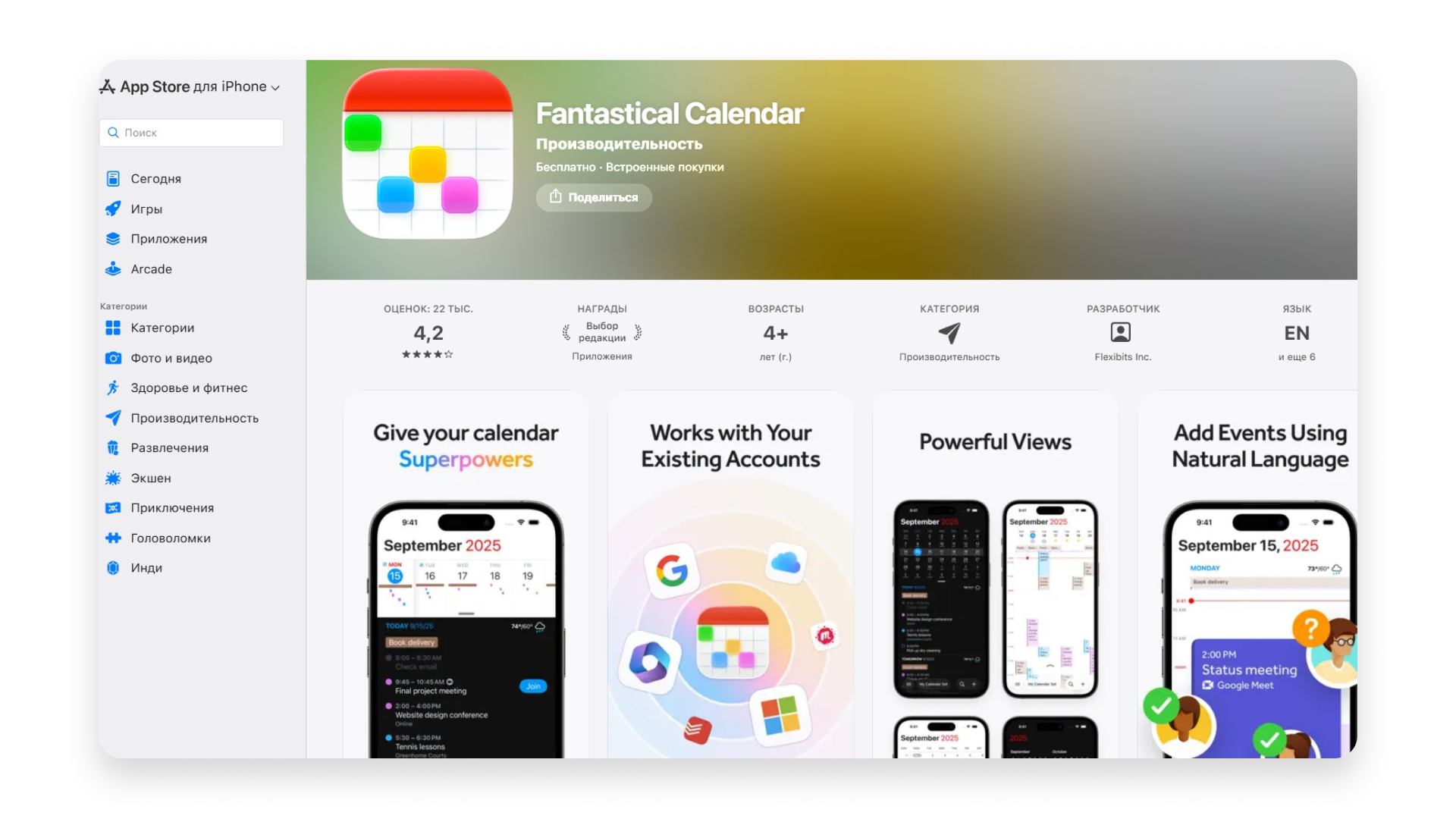Приложение синхронизировано с разными календарями и помогает искать события в списке с помощью функции Spotlight. Режимы просмотра можно менять — несколько дней, неделя или месяц. Планировщик автоматически рассчитывает время, за которое можно добраться пешком или на транспорте до указанного в задаче места.