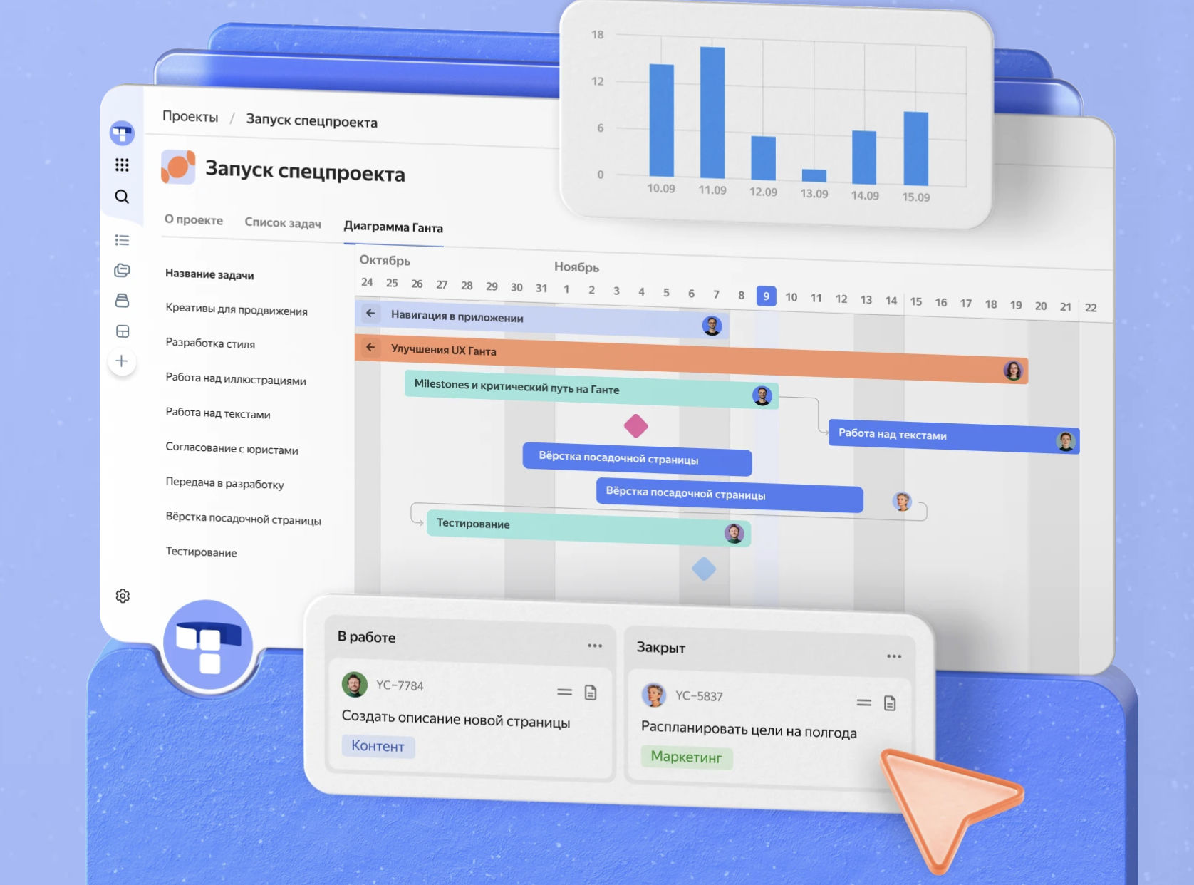 - Разные виды отображения задач: Доски, Месяц, Неделя, Список и Гант