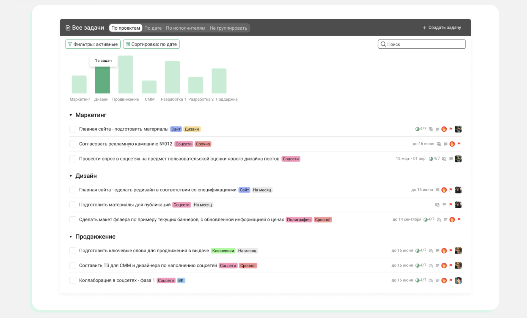 - Гибкое отображение задач (списки и Канбан)