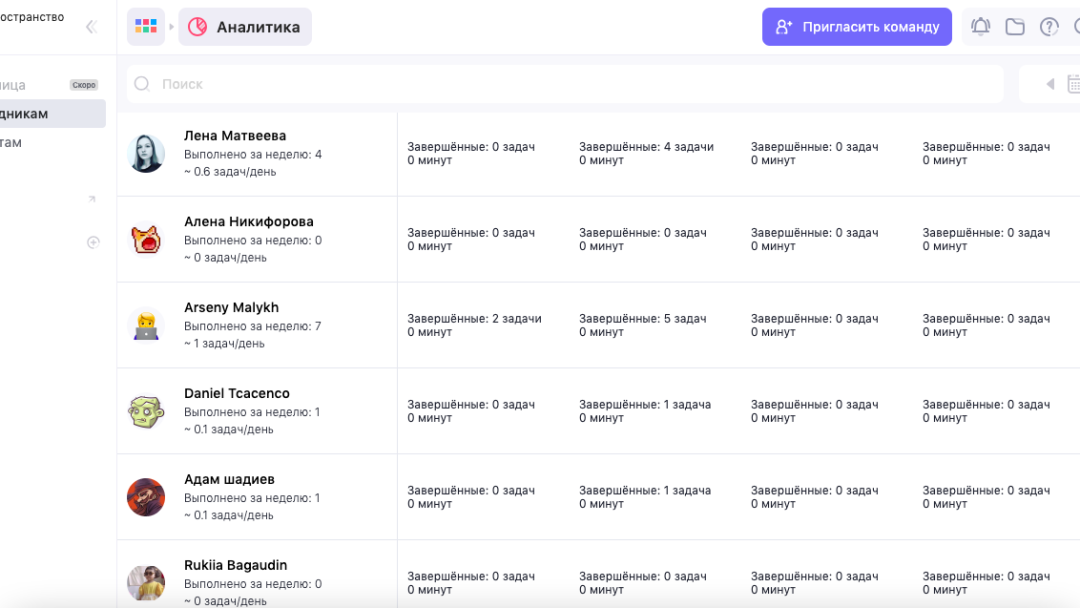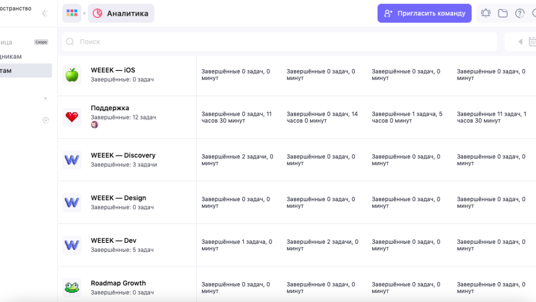 А ещё можно получать отчёты по задачам в сервисе Аналитика. Там есть информация по отдельным проектам и сотрудникам: