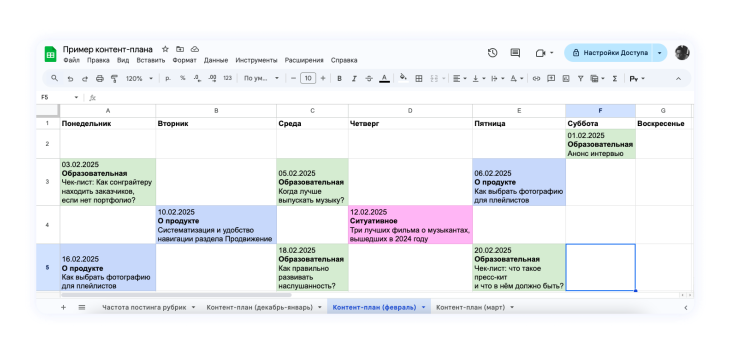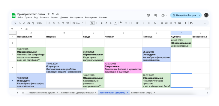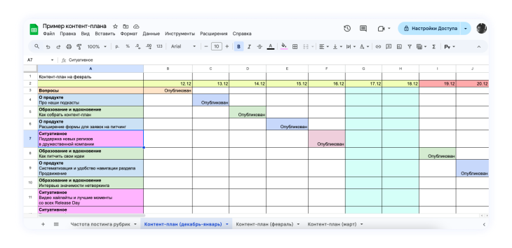 - Пример контент-плана на неделю и месяц в Google Таблицах