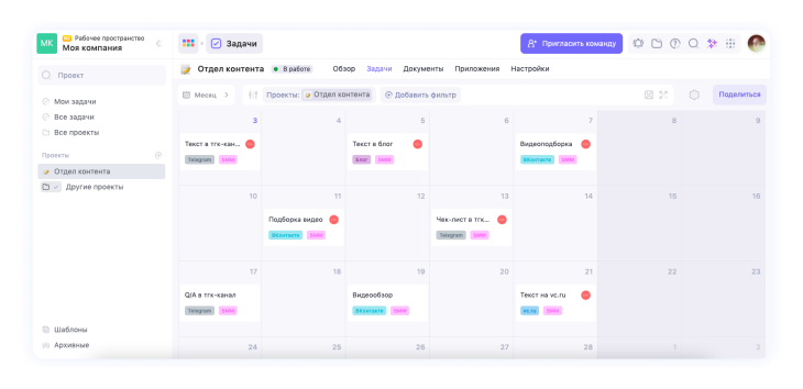 Для этого расставь задачам даты публикации и переключи режим отображения задач на Месяц. Добавь теги по типу контента или площадкам — например, SMM, Telegram, vc.ru и так далее.