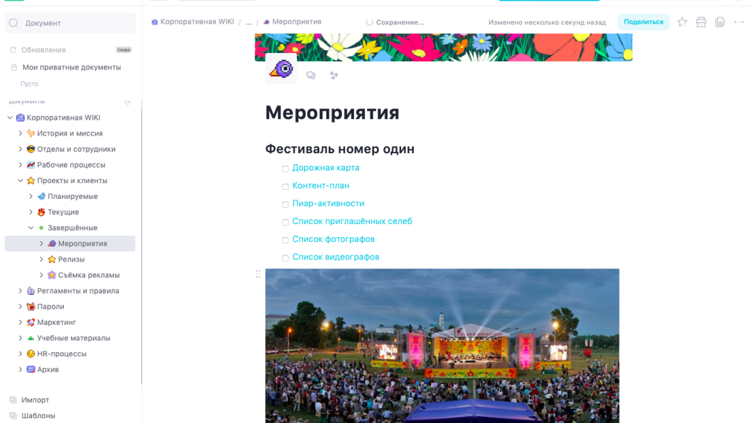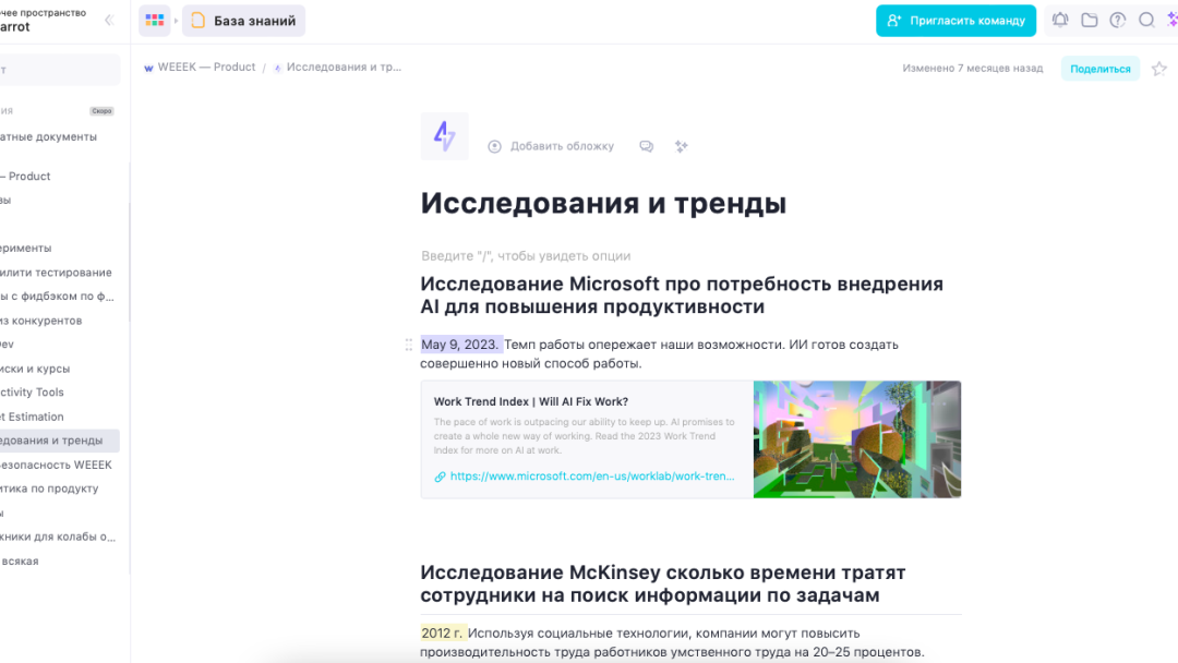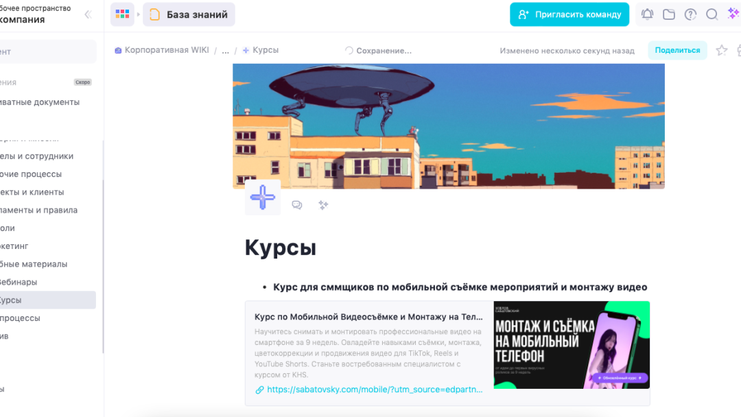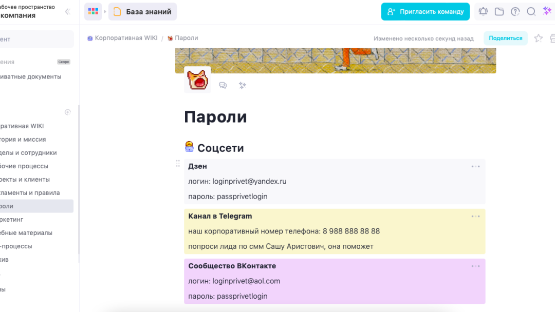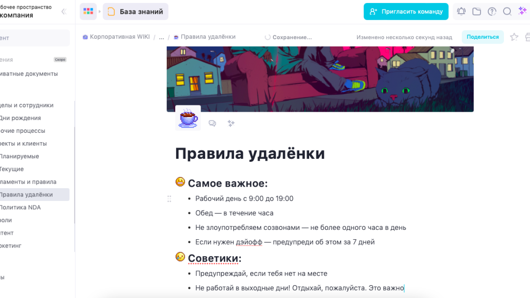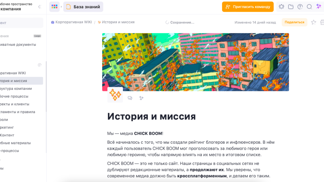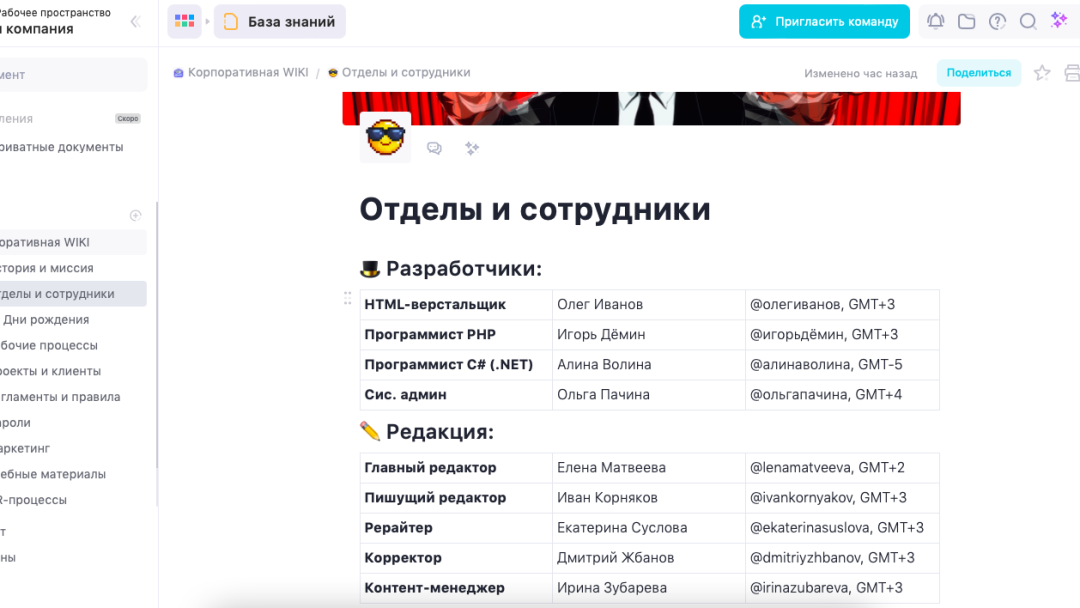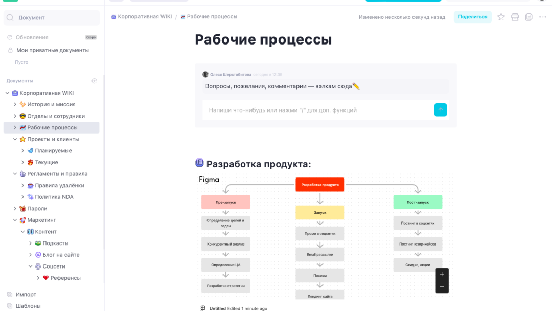 - Корпоративная вики (или база знаний) — платформа для эффективного управления информацией с общим доступом для команды