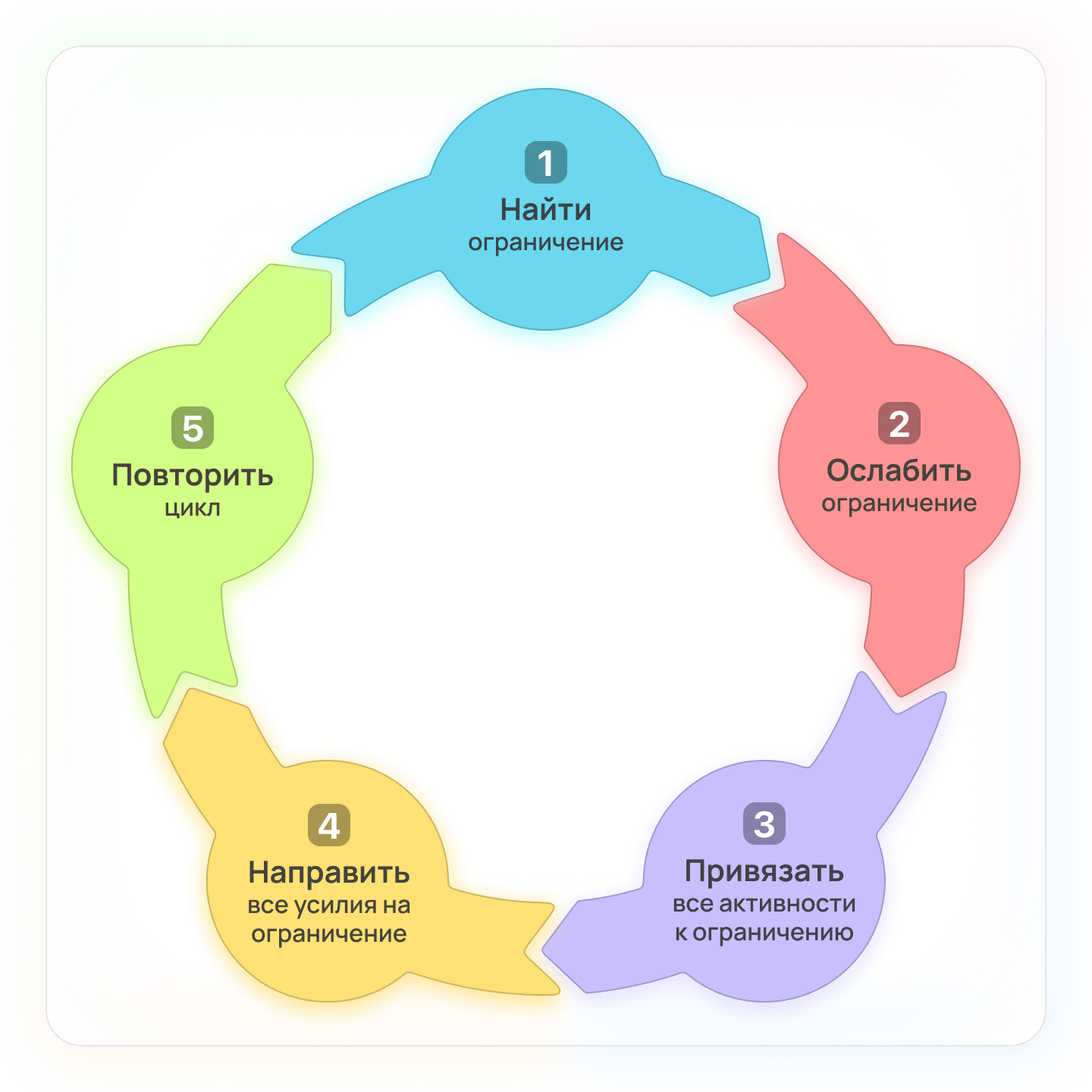 Не распыляйся, фокусируйся на ключевых ограничениях, не дающих компании работать максимально эффективно. Последовательно устраняя узкие места, ты сможешь за короткое время многократно увеличить производительность всей системы в целом. Для этого следуй циклу из пяти шагов, который я описал выше.