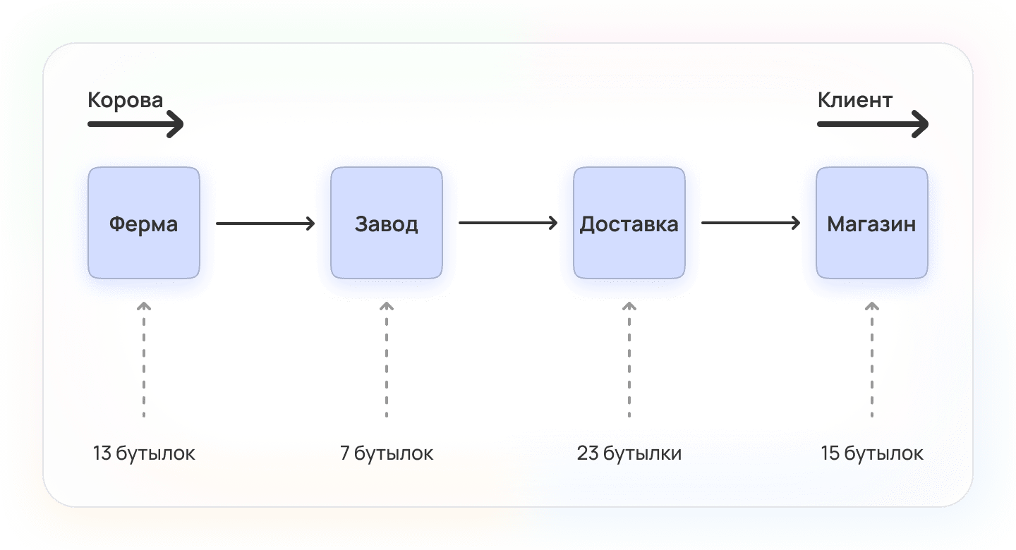 Проще всего разобраться на примере. Представь цепочку поставок молока в магазины (я не гарантирую, что в моём примере она правдоподобная, но, что называется, «я так вижу»). Сперва молоко добывают на ферме, затем отправляют на завод, где стерилизуют и упаковывают в тару. Следом молоко отправляют с помощью логистической компании в магазин, где продают его конечным потребителям. Допустим, у каждого этапа есть своя пропускная способность — сколько бутылок молока может пройти через этап за период времени: