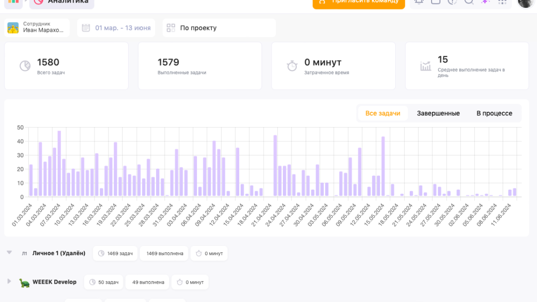Информацию о сотрудниках смотри в сервисе Аналитика или в истории конкретных задач. Там же можно посмотреть загруженность по отдельным проектам и собрать детальный отчёт.