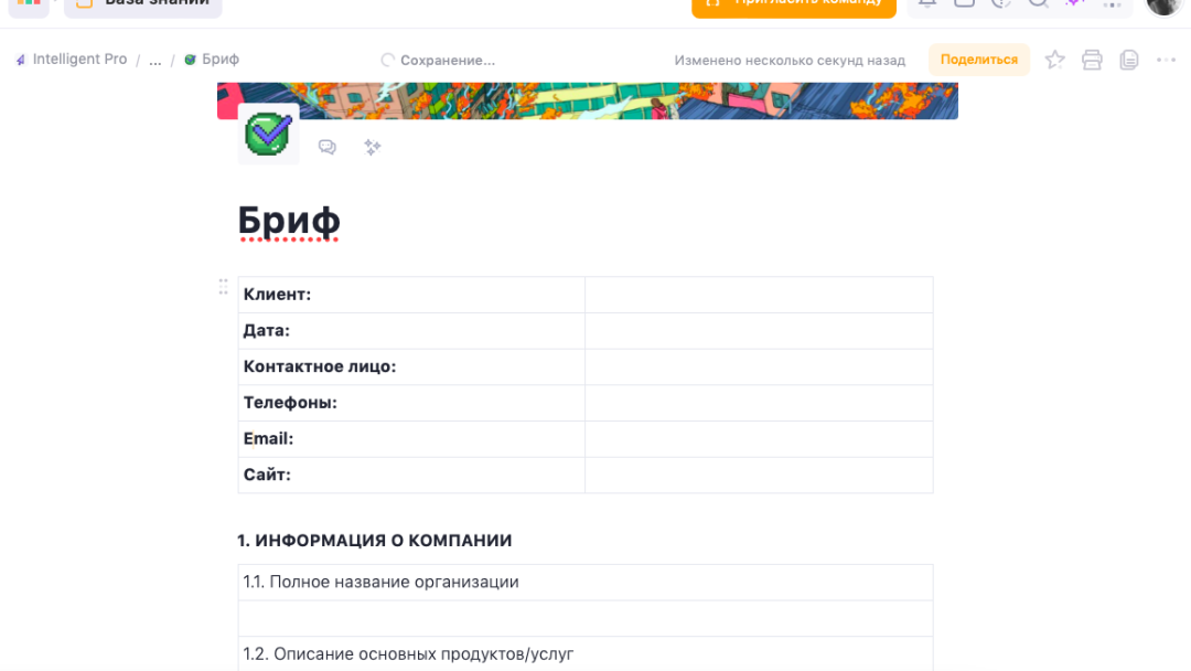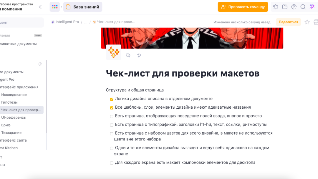 - Типовые документы. Это бриф, техзадание, чек-листы и другие. В дизайн-процессах удобно использовать стандартный бриф, чтобы ответы от заказчиков приходили в единой форме и в нужном формате. Техзадание для дизайнеров и разработчиков тоже лучше делать стандартным — чтобы получать гарантированный результат. А чек-листы пригодятся для самопроверки результатов работы команды. Чтобы не тратить время на подготовку каждого из них с нуля, создавай и используй шаблоны из Базы знаний.