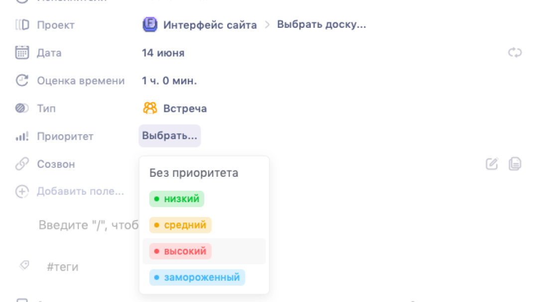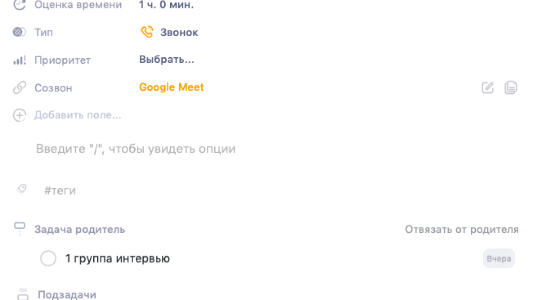 Функция Оценка времени на задачу поможет правильно распределить рабочее время и нагрузку. Эти фичи пригодятся при почасовой оплате или если важно оценить, сколько времени уходит на определённые задачи.
