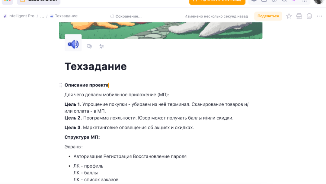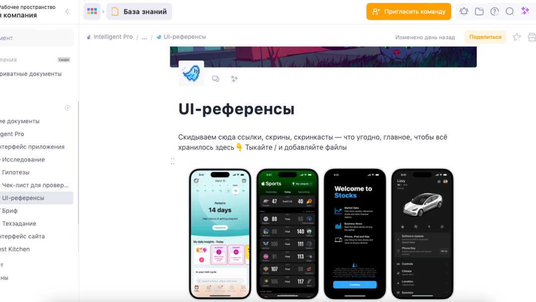 - Документы для конкретных проектов и задач — референсы, гипотезы, исследования и другие. Храни их в общем доступе и всегда подтягивай к проектам, к которым они относятся, — тогда команда не будет терять ссылки и скриншоты.