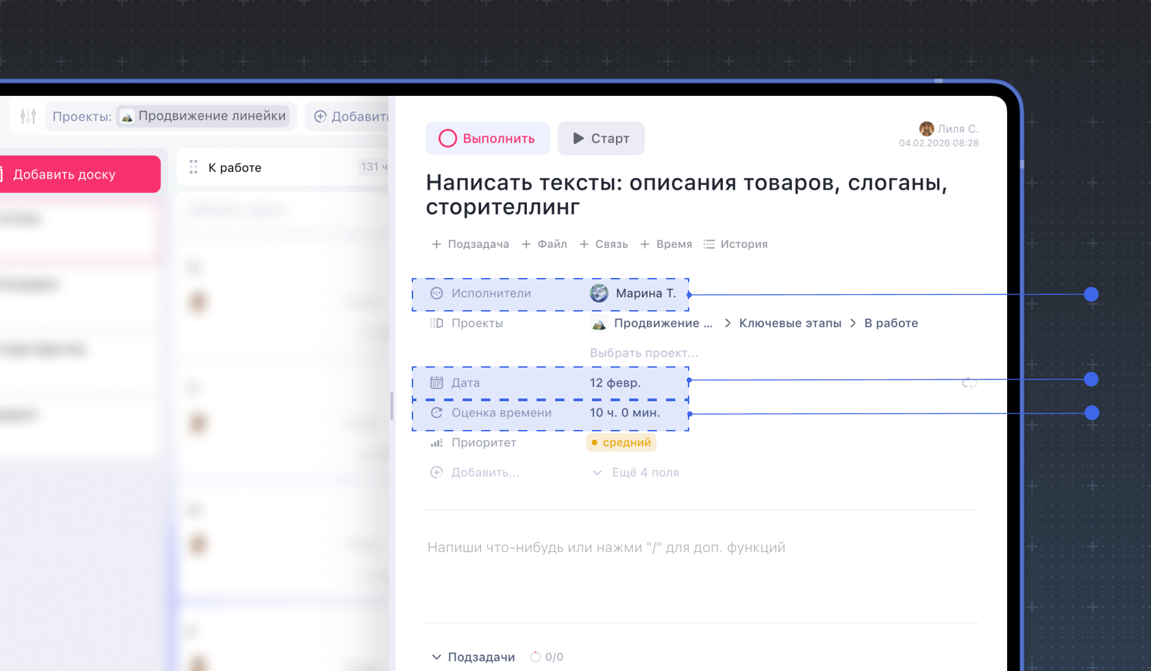 Чтобы часы работы по задаче отобразились в Загруженности, в ней должны быть заполнены поля Исполнитель, Дата и Оценка времени.
