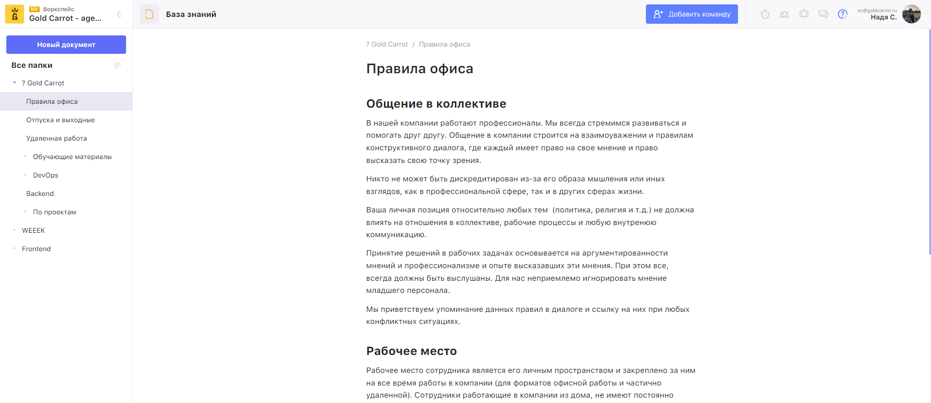Выбери площадку для хранения регламента — советую делать это в облачном хранилище или в таск-менеджере, чтобы сотрудник зашёл в любой момент и ознакомился. У нас в WEEEK, например, для этого База Знаний, где мы описываем бизнес-процессы и корпоративную культуру нашей компании.