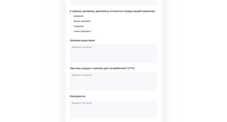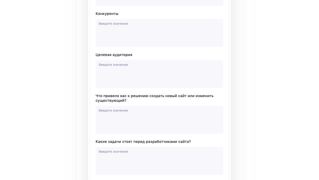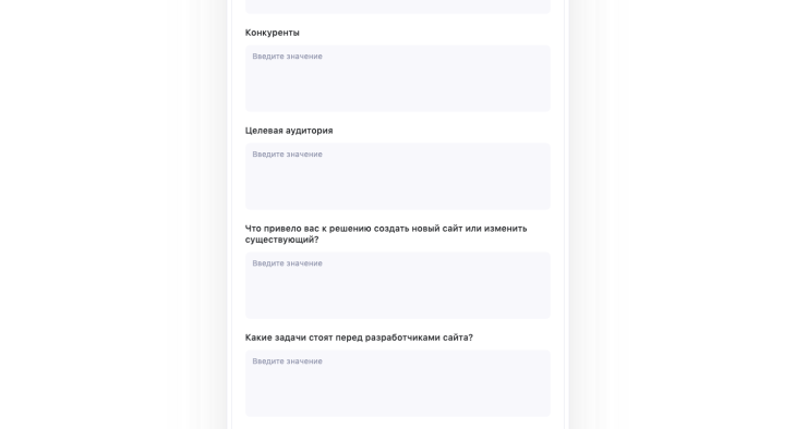 Выше мы перечислили общий список вопросов: о компании или проекте, контактной информации, целях, целевой аудитории, конкурентах, сроках и бюджете.