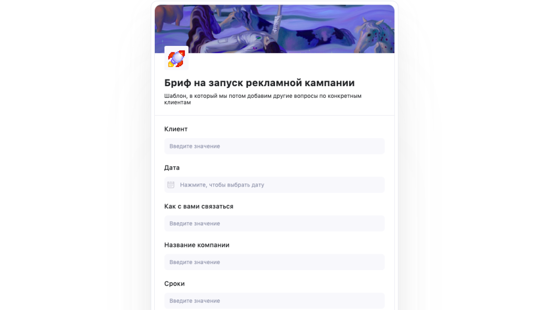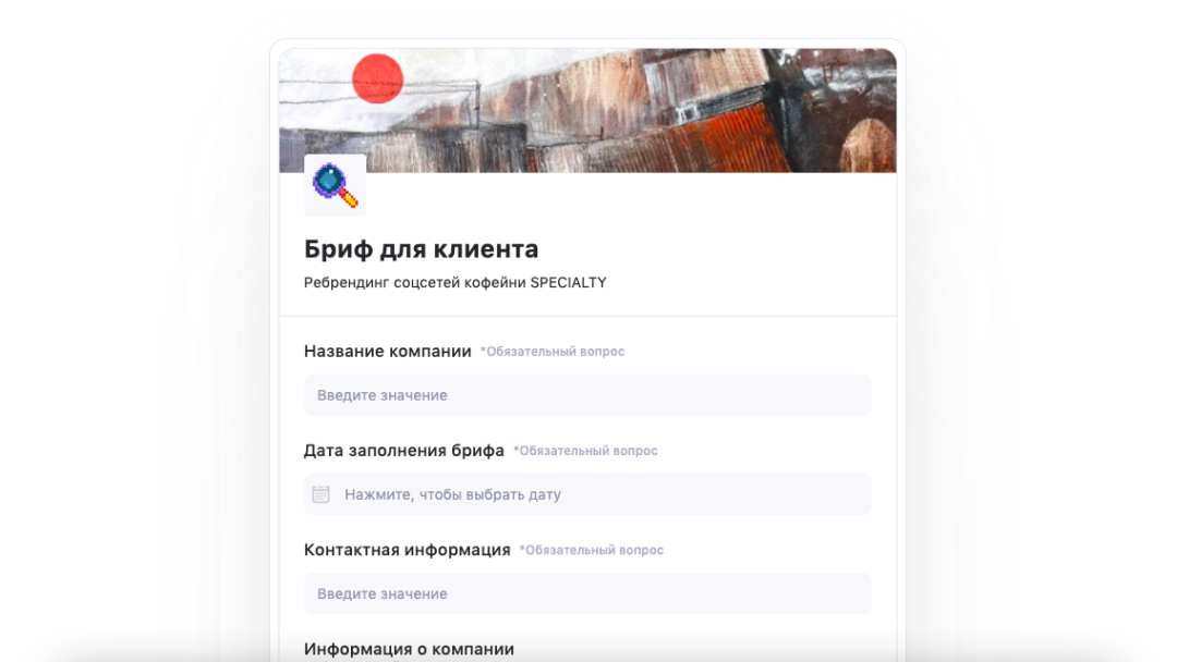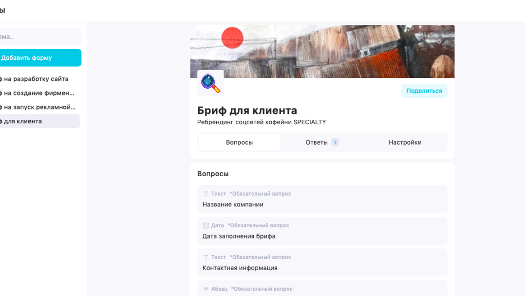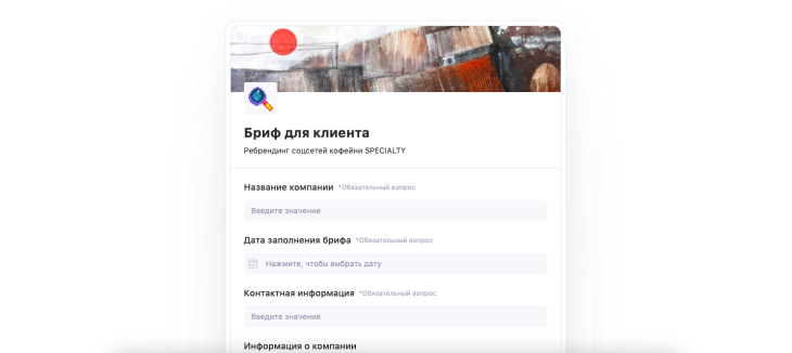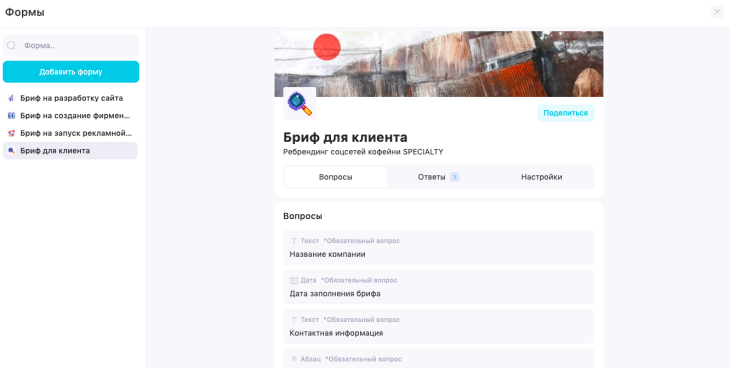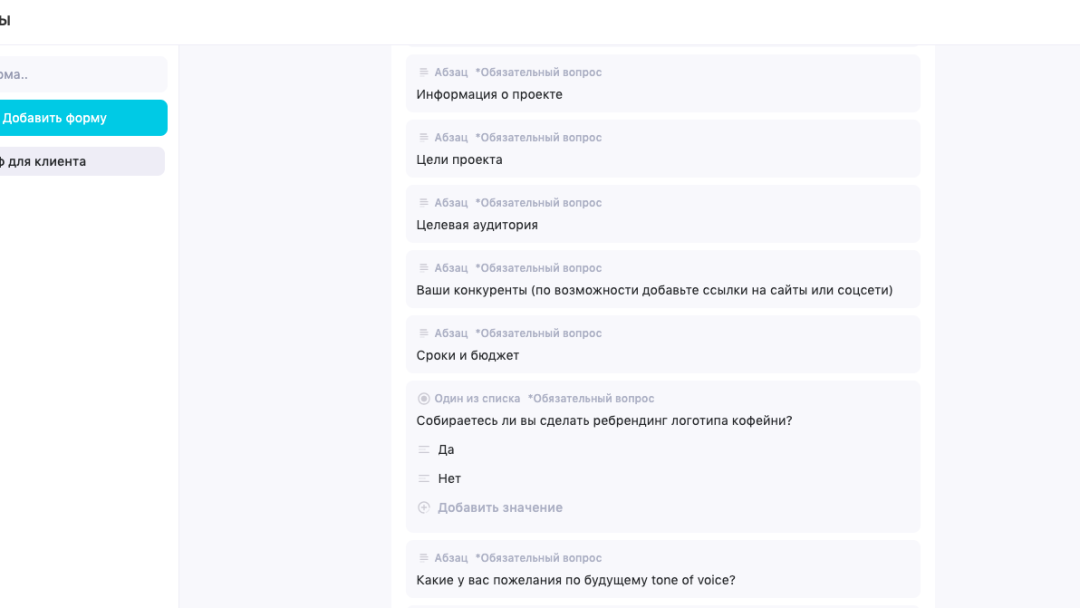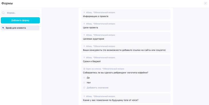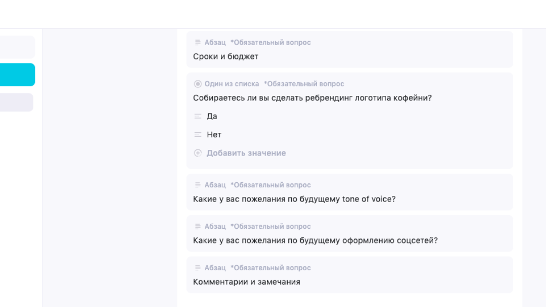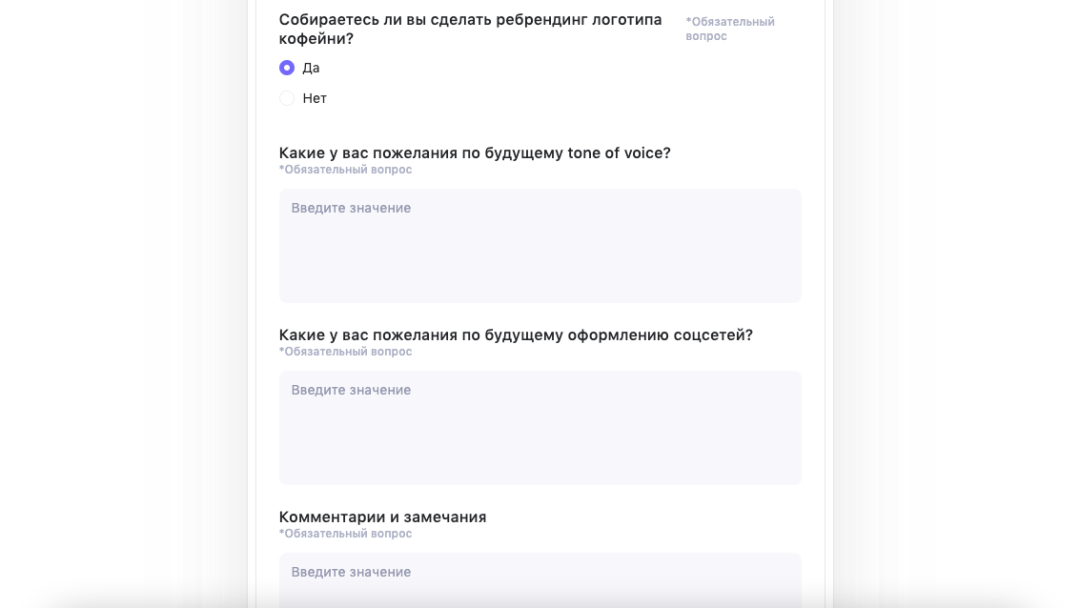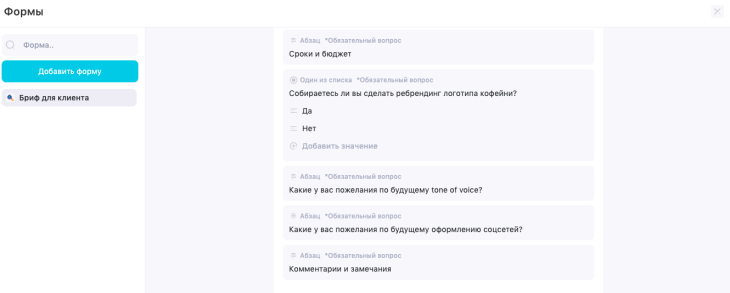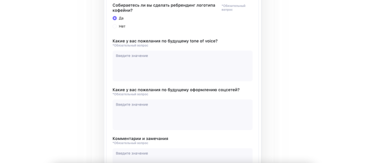Теперь необходимо добавить вопросы к конкретному заказчику. Возьмём пример ребрендинга в соцсетях кофейни.