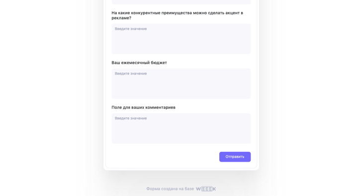 Когда форма готова, её можно отправить с помощью кнопки Поделиться. Далее нужно активировать переключатель — Поделиться формой в интернете. И вуаля! Она станет доступна для всех получателей ссылки, которую можно открыть в браузере. Регистрация и вход в WEEEK для этого не требуются.