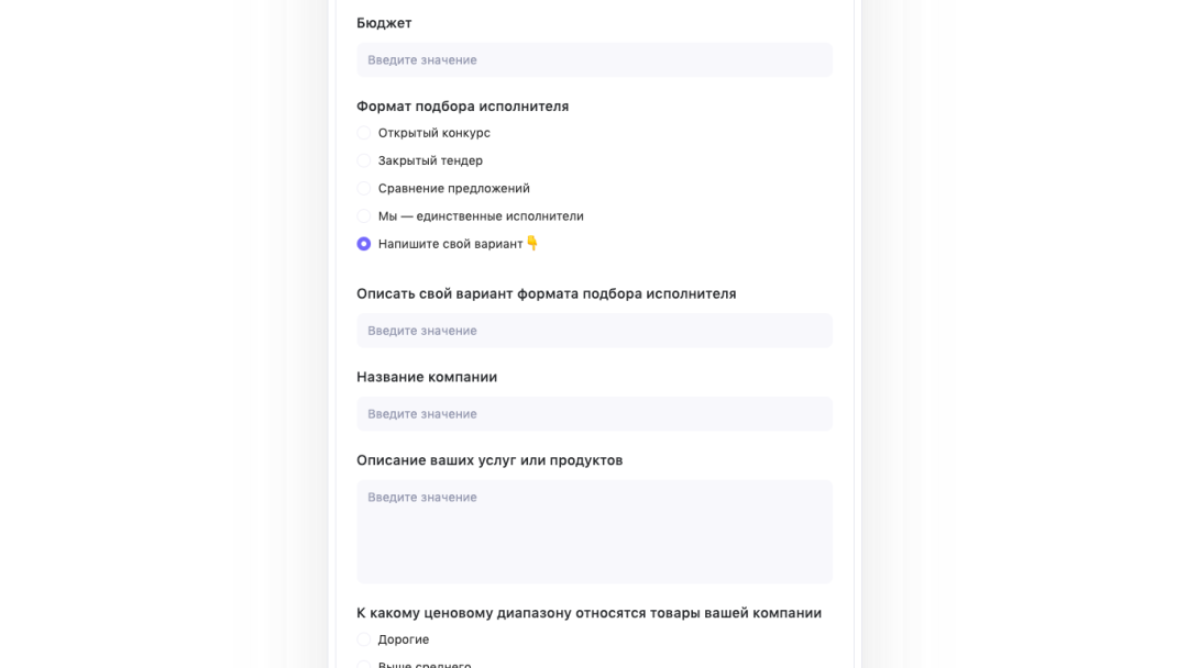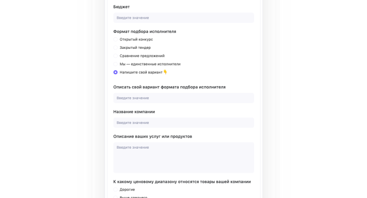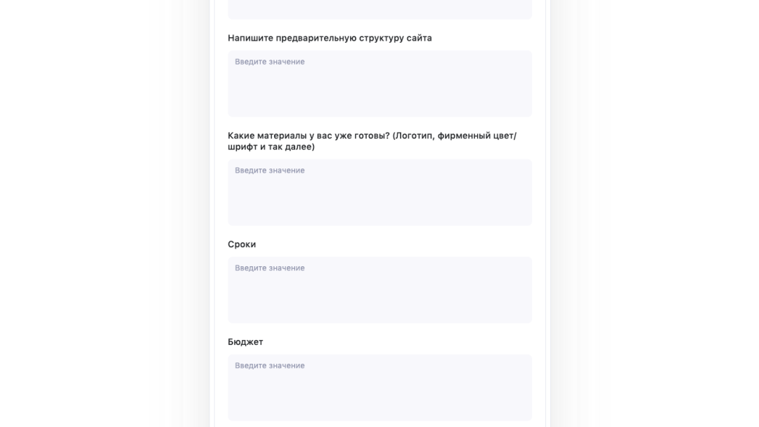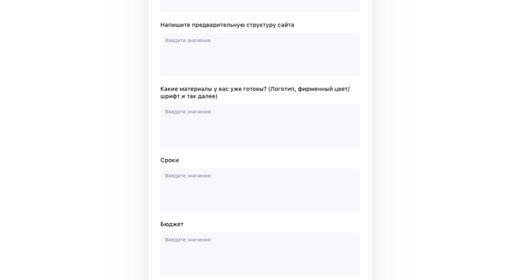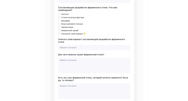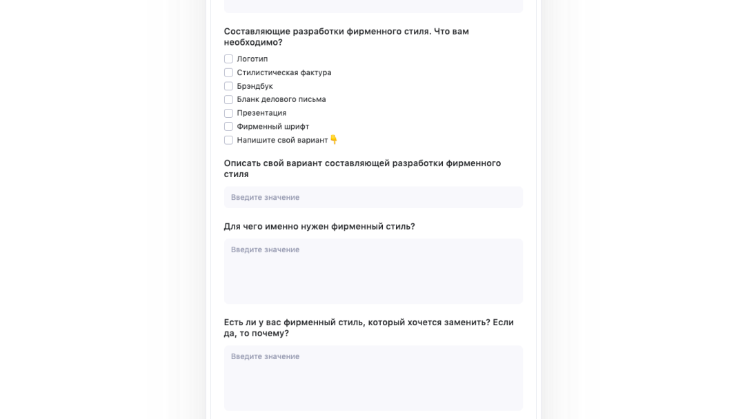 - Текст. Подойдёт для оформления вопросов, где от заказчика нужен короткий ответ. Например, название компании и контакты.