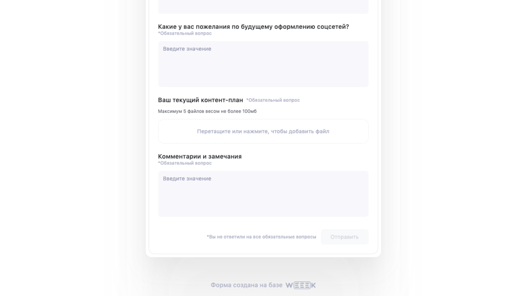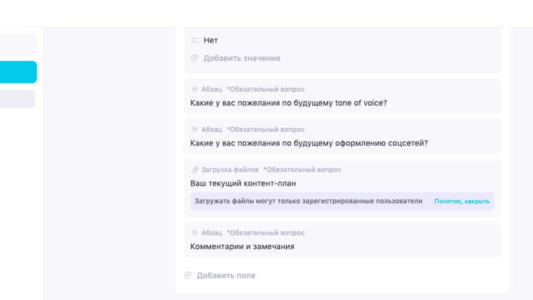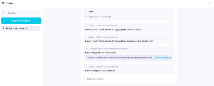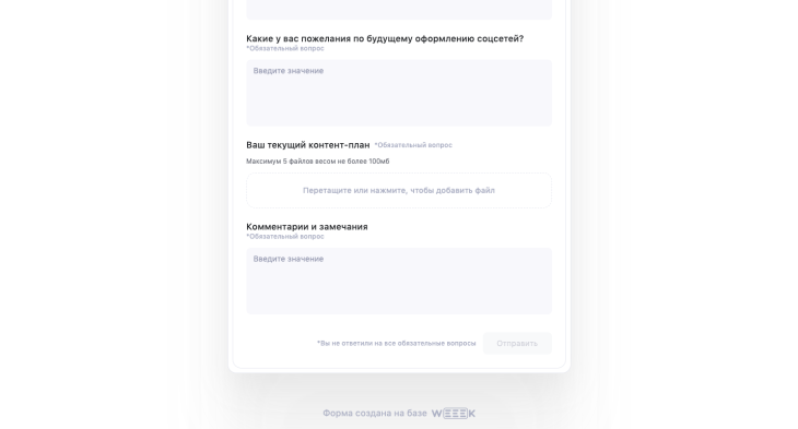 - Загрузка файлов. Если заказчику нужно прикрепить к брифу какой-то документ. Например, контент-план.