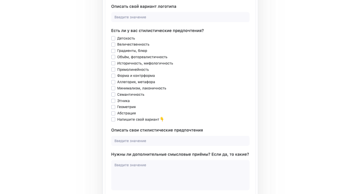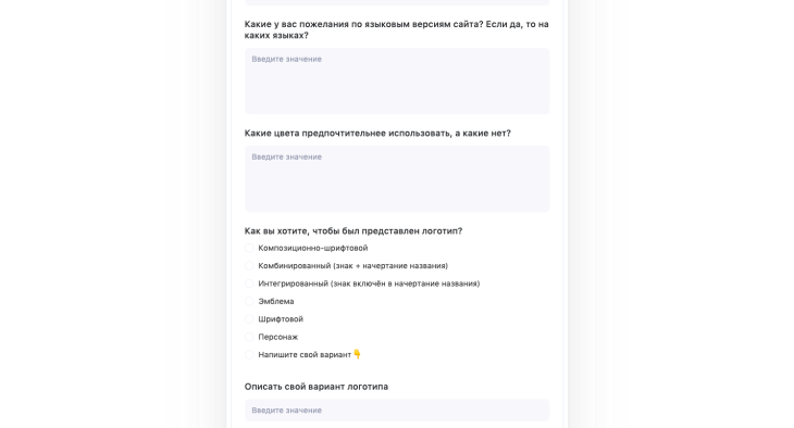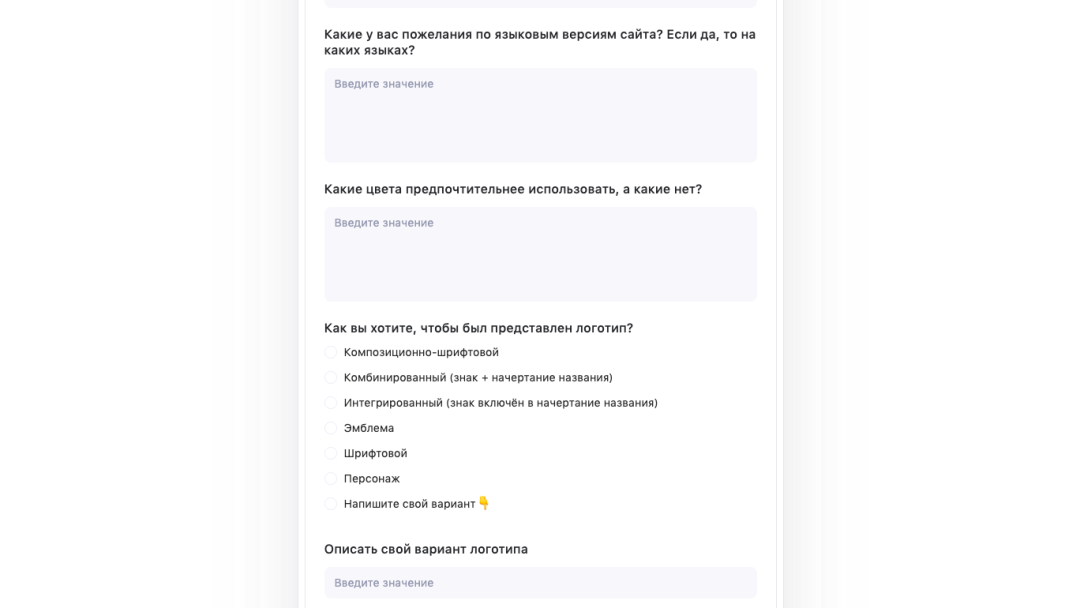 - Сделай бриф понятным для всех. По возможности в скобках добавь примеры ответов. Так исполнитель не забудет, что имел в виду в некоторых вопросах, а заказчик сразу поймёт, что от него требуется.