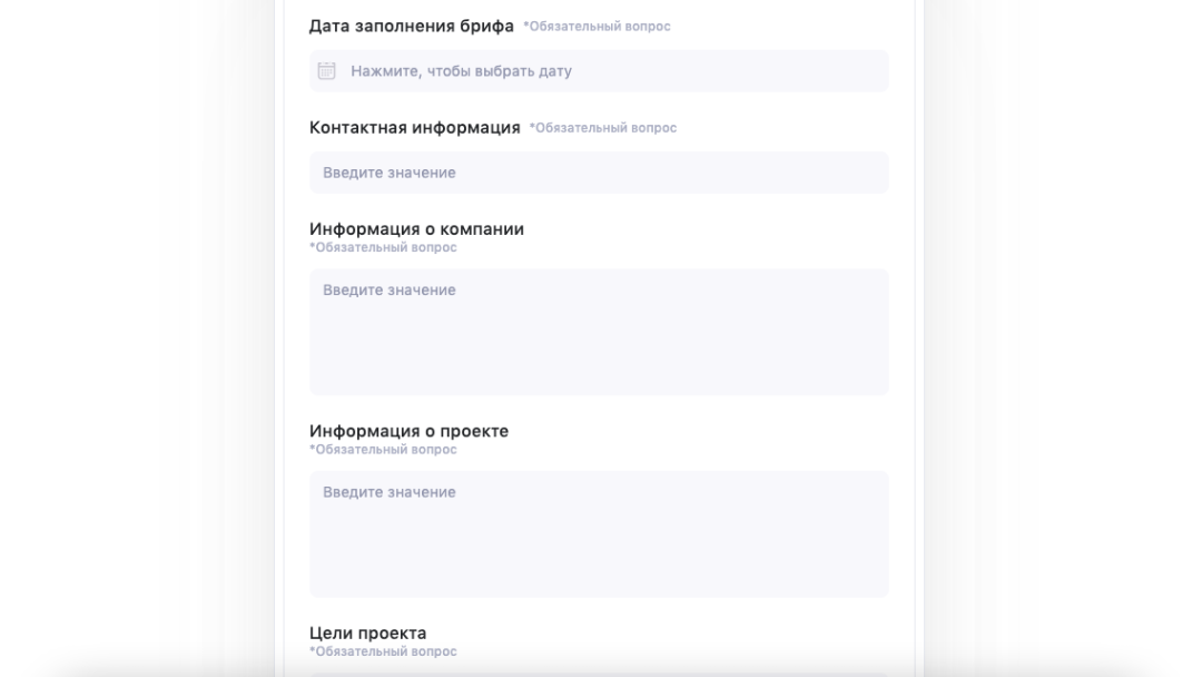 - Соблюдай логичную структуру брифа. Раздели вопросы по смысловым блокам. Например, общие вопросы (имя, контакты, дата), информация о компании, о проекте, требования, дополнительная информация.