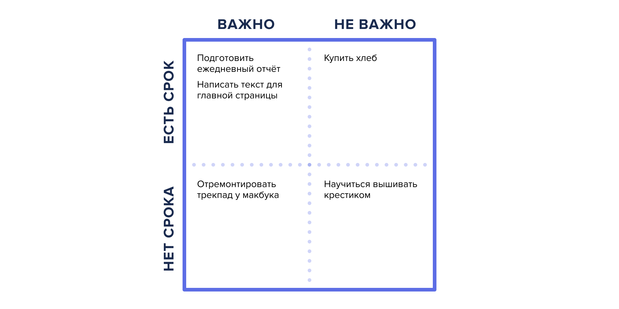 Выпиши в эту матрицу все дела, которые занимают место в голове. А потом приступай: начни с задач, у которых есть срок, а параллельно присваивай сроки задачам, у которых срока нет, но которые важны.