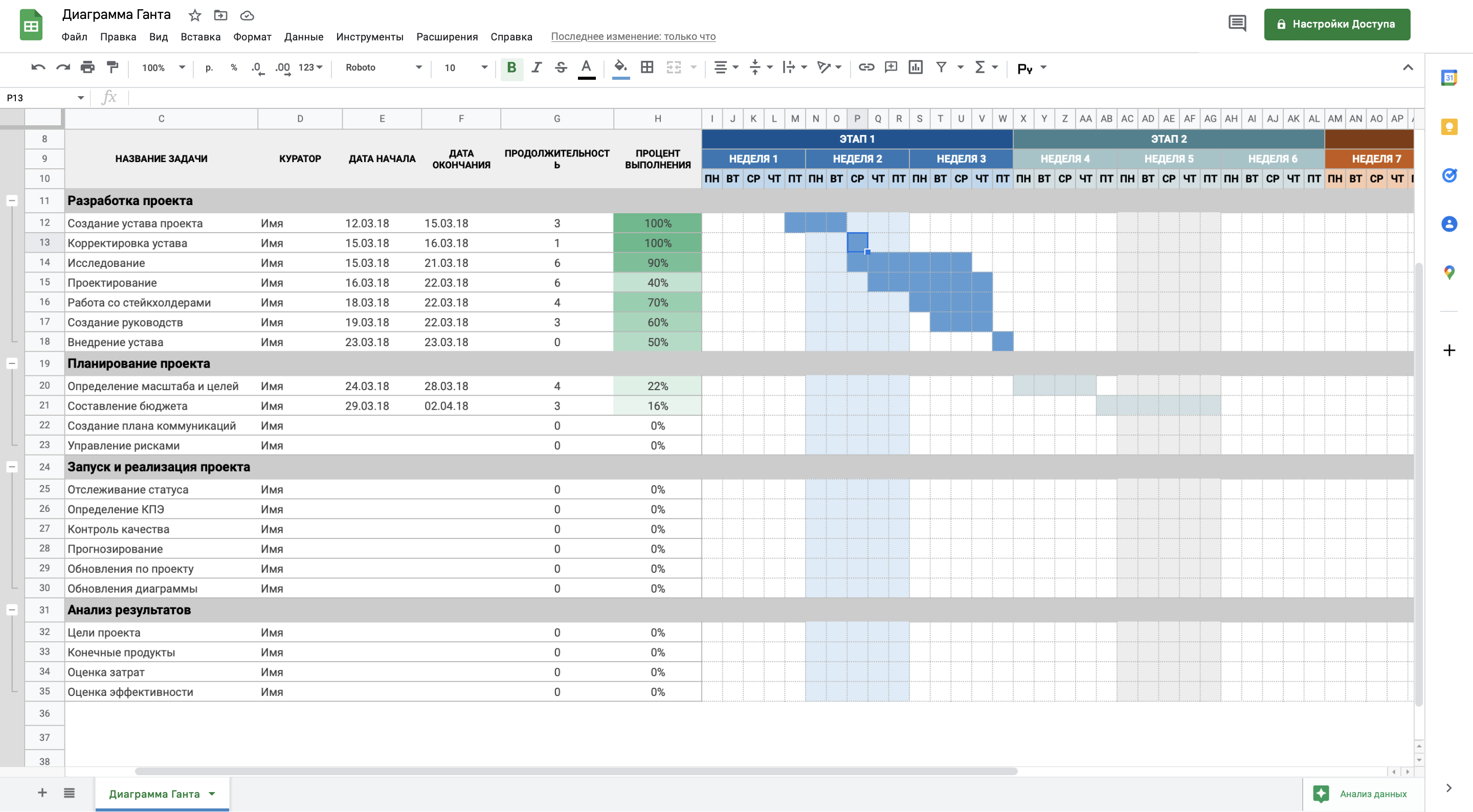 Есть мнение о том, что это самый удобный формат ведение проектного календаря. Ты можешь найти готовые сервисы, в основе планирования которых стоит диаграмма Ганта, например GanttPRO. Если готовый сервис слишком сложный и нагруженный для тебя, то для календаря проекта с помощью диаграммы есть готовый шаблон внутри Excel. Его можно найти на гугл-диске, для этого: