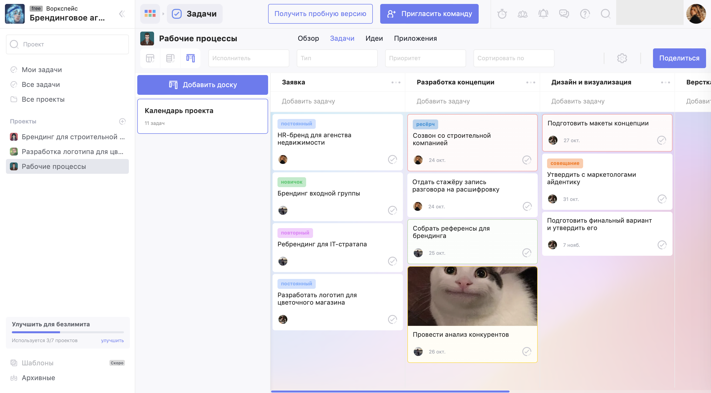 Первый столбец – все заявки, которые могут ждут эту проектную команду разработки брендинга, следующие – этапы работы над проектом. Для наглядности можно использовать приоритеты, они помогут выделить карточку цветом: красный – васокий, зелёный – низкий и другие. С помощью тегов ты можешь отметить ключевое свойство работы над задачей или как в первом столбце теплоту лида: постоянный клиент, первое обращение или второе.