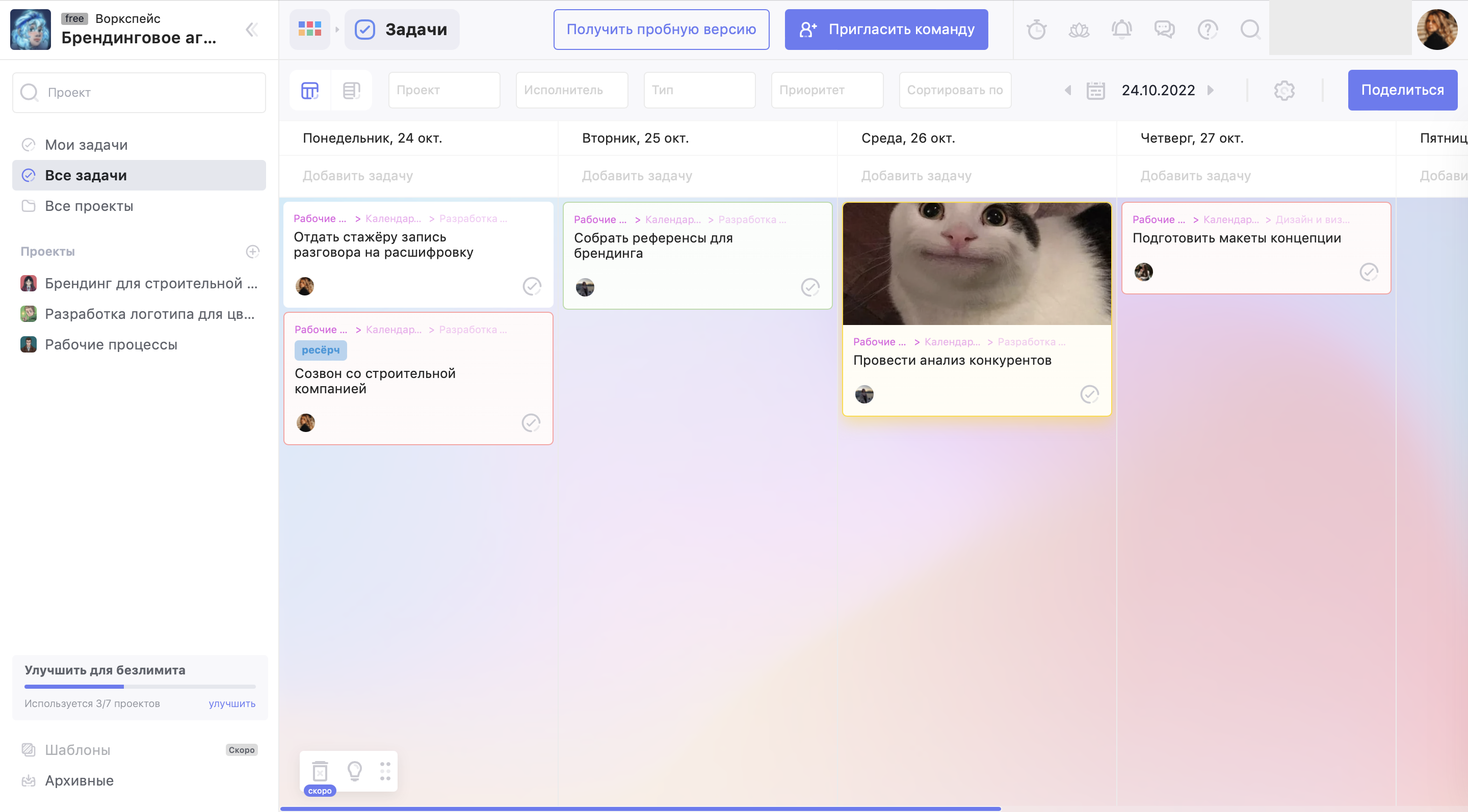 Очень удобно, что вы можете разбить этапы работы над проектом на задачи и подзадачи. Есть этап работы над брендингом компании. Внутри этого этапа необходимо сделать маленькие шаги, за которые могут быть ответственны несколько человек. Получается, что основная задача остаётся перед глазами как маркер, на который можно ориентироваться руководителю, а сотрудники ставят задачи внутри него. У каждой задачи есть настройки. Создатель может: