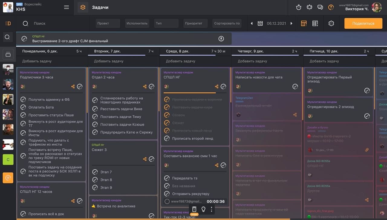 - WEEEK удобный. Под каждого сотрудника — доски, под каждый проект — тоже доски. Так мы соблюдаем дедлайны, не путаемся в задачах и распределяем нагрузку так, чтобы никто в команде не выгорал.