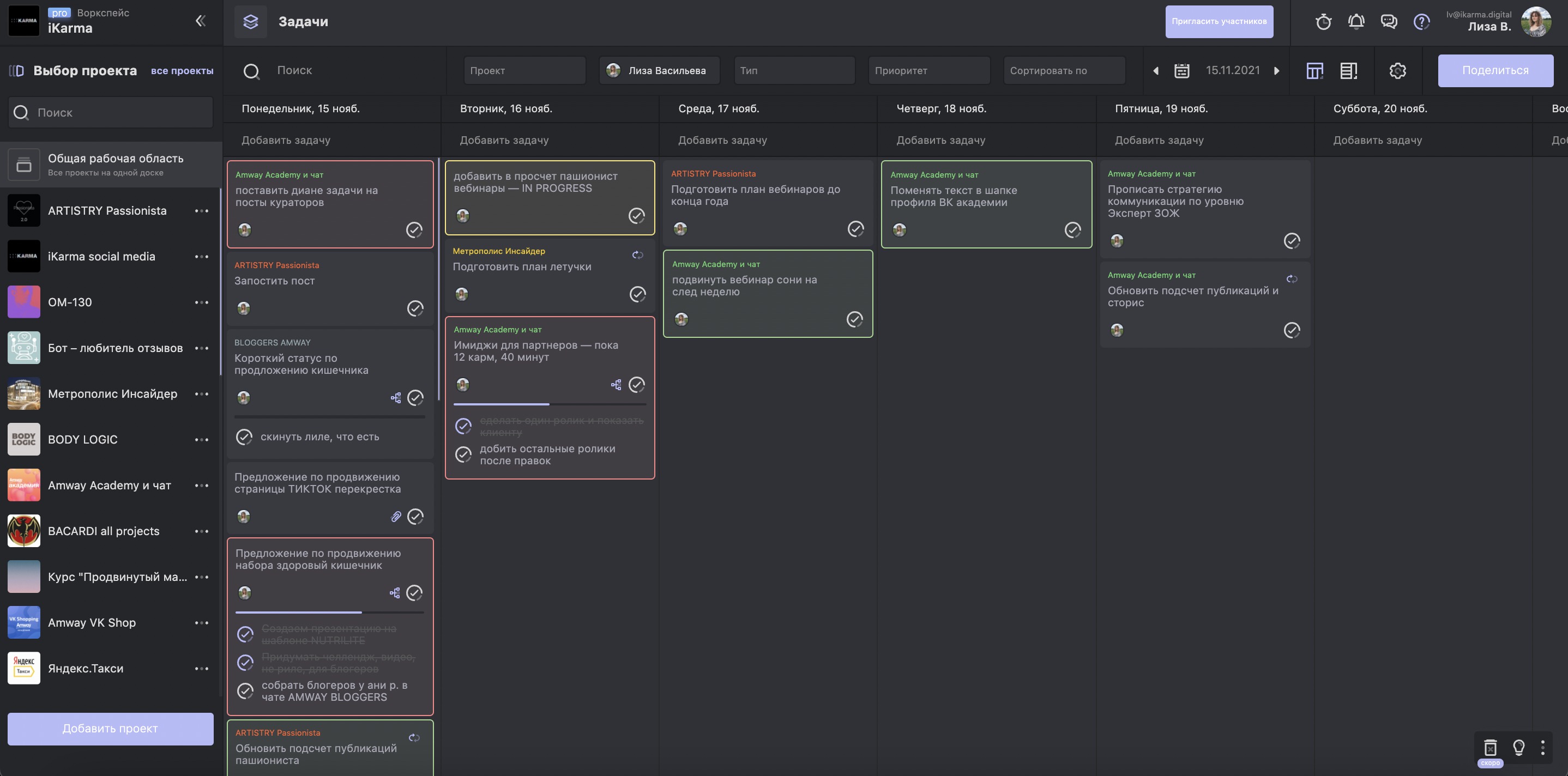 В WEEEK чаще пользуемся таск-менеджером, благодаря которому решили важную (и единственную) проблему — забытые задачи, которые теперь сразу фиксируем и распределяем по дням и по проектам. А это важно при работе с клиентами и рядом проектов одновременно.