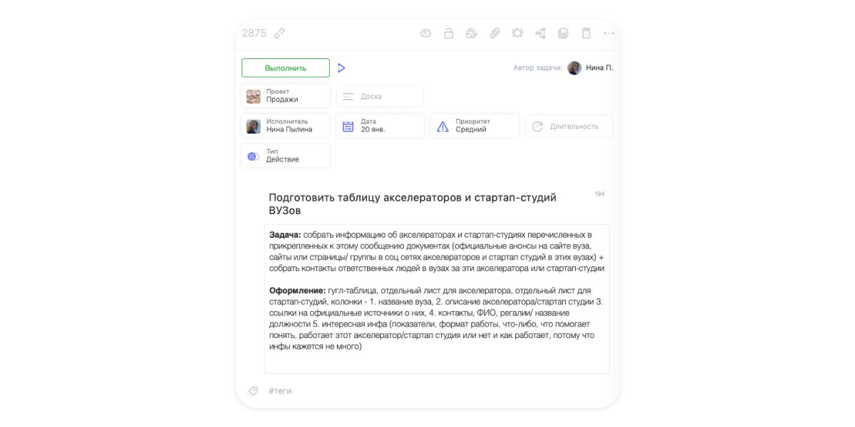 - Руководители смотрят, кто как работает и выполняет задачи, а также сами ставят задачи сотрудникам. Часто пользуемся Аналитикой — удобно сразу смотреть, кто как работает в разрезе дня и недели.