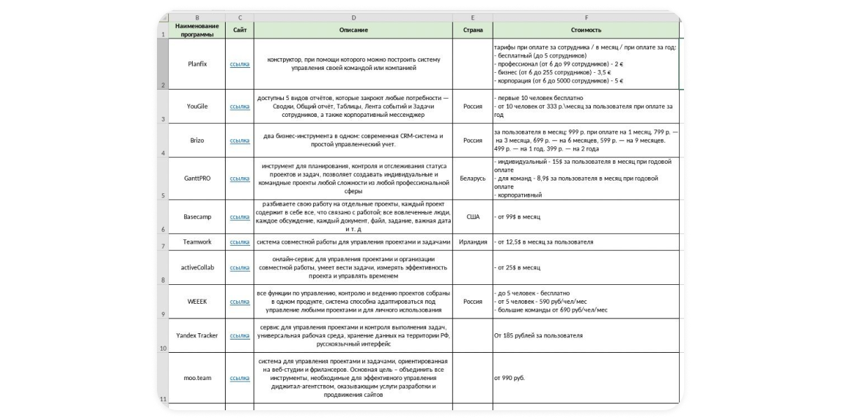 Искать новые технологии и решения — наш профиль, поэтому подошли к процессу ответственно. Аналитики перебрали российские сервисы для менеджмента и собрали около 30 в таблицу.