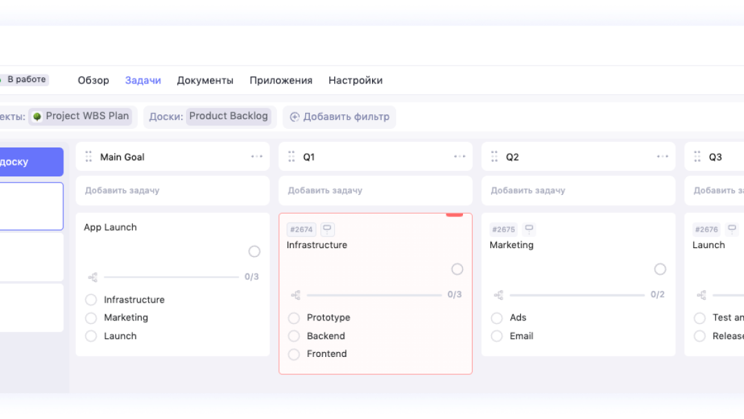 Иерархия показывает взаимосвязи, которые строятся от подзадачи к задаче, от задачи к группе. Если распределить всё грамотно, то не останется незакреплённых или продублированных задач. Иерархия структурирует объём работы и исключает хаос из тысячи мелких задач.