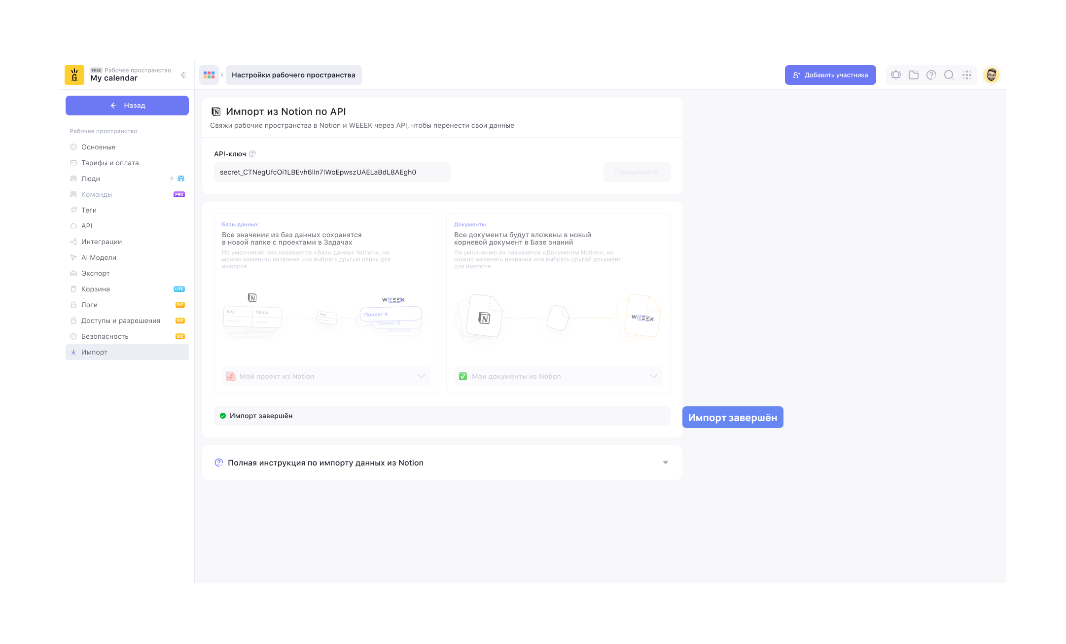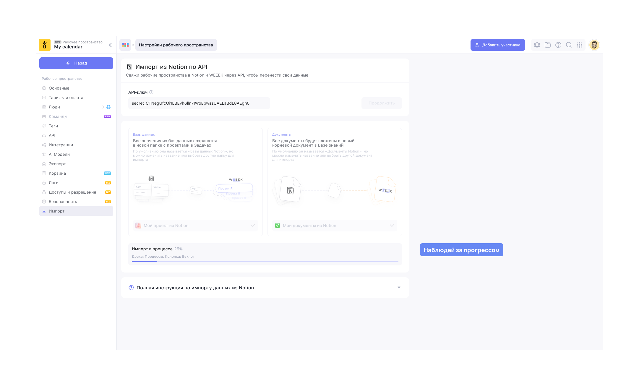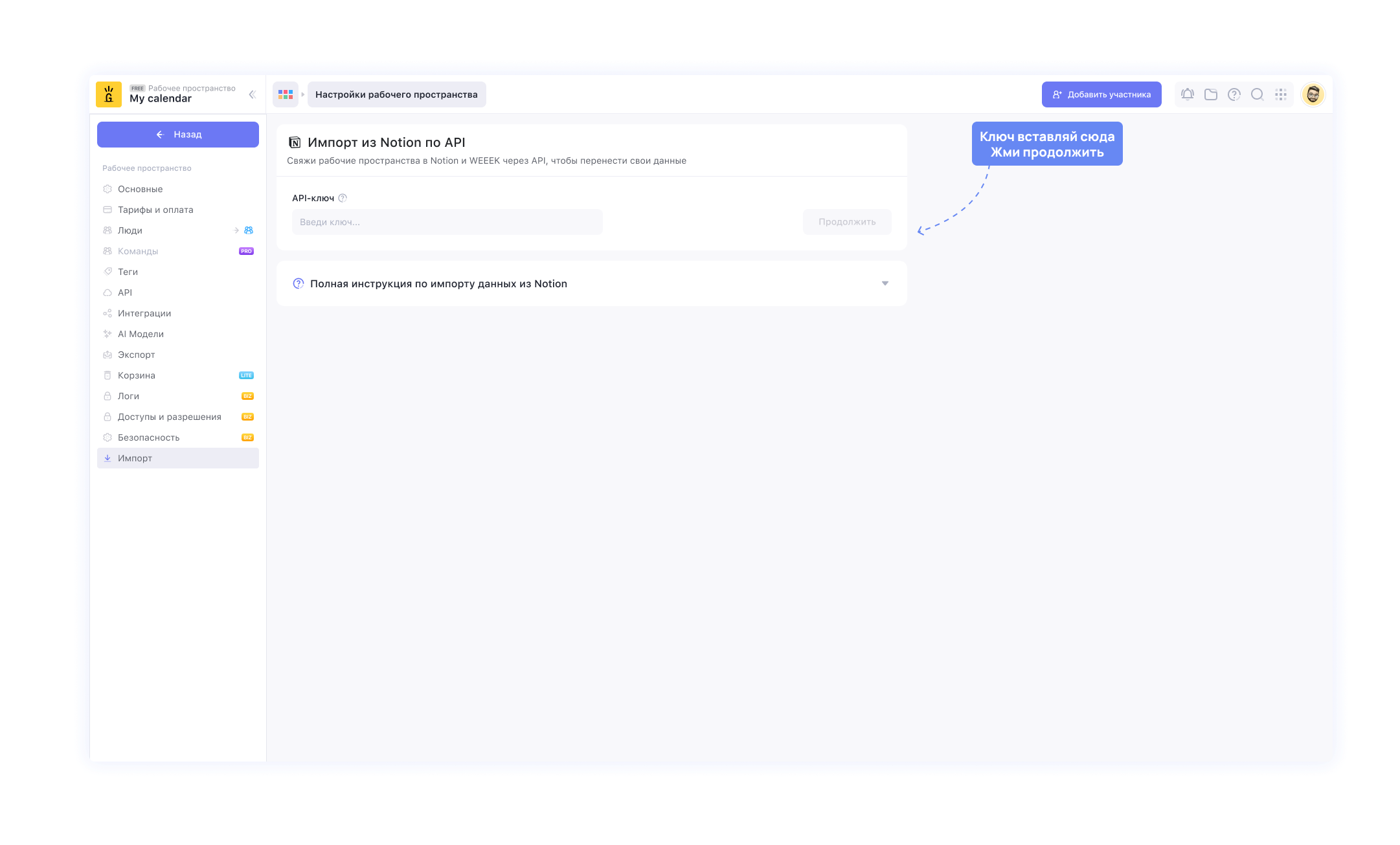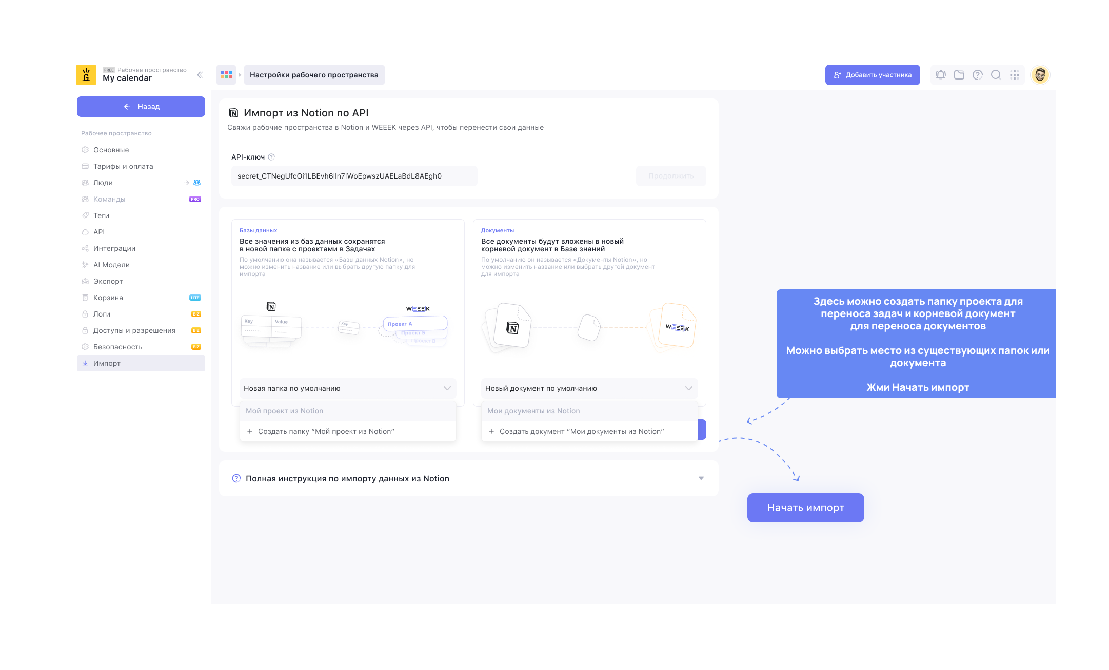 Проверь, что API-ключ всё ещё с тобой в буфере обмена. И с Notion всё, идём в WEEEK.