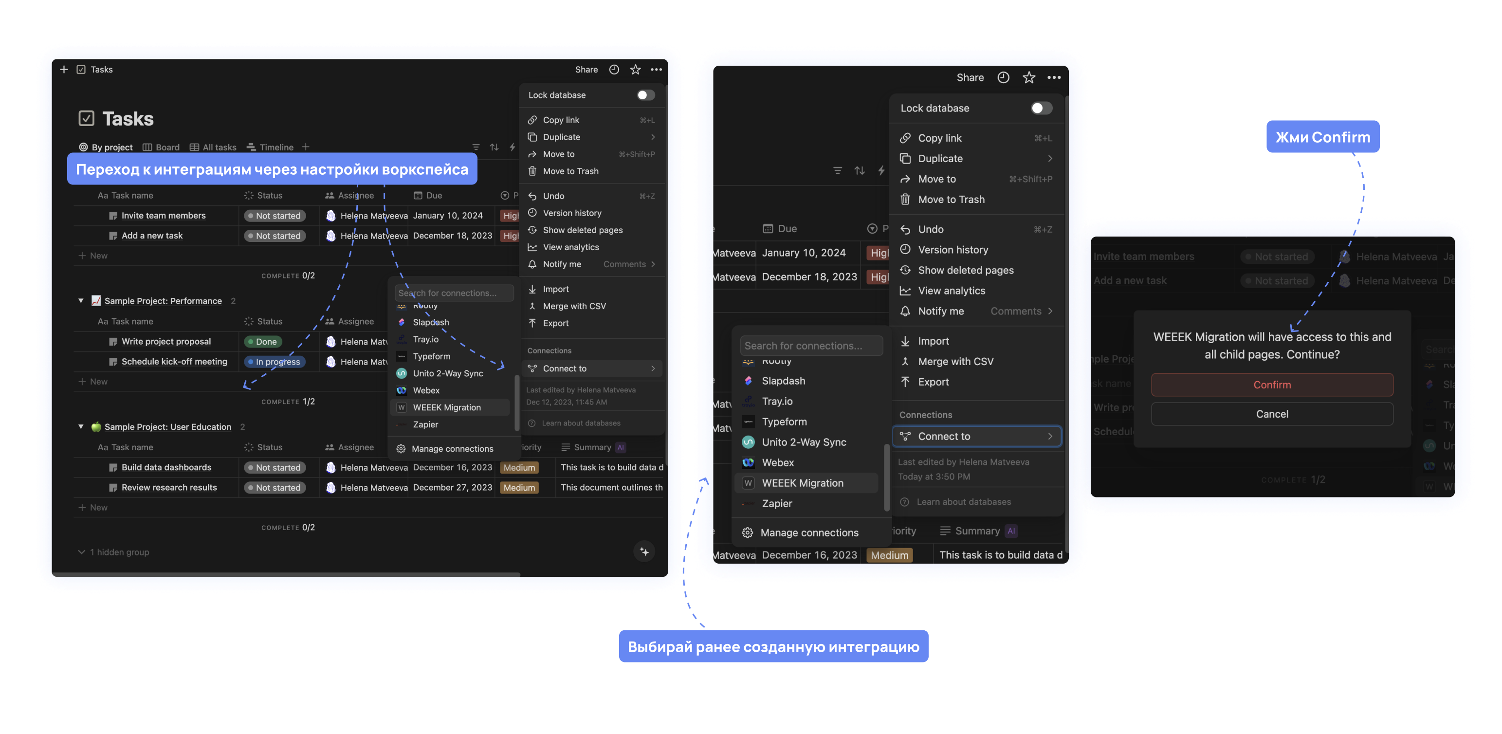Для начала постраничного переноса поочередно заходи на каждую страницу и жми ••• справа сверху. Внизу выпавшего окна ищи Connect to. Затем выбери свою интеграцию и нажми Confirm.